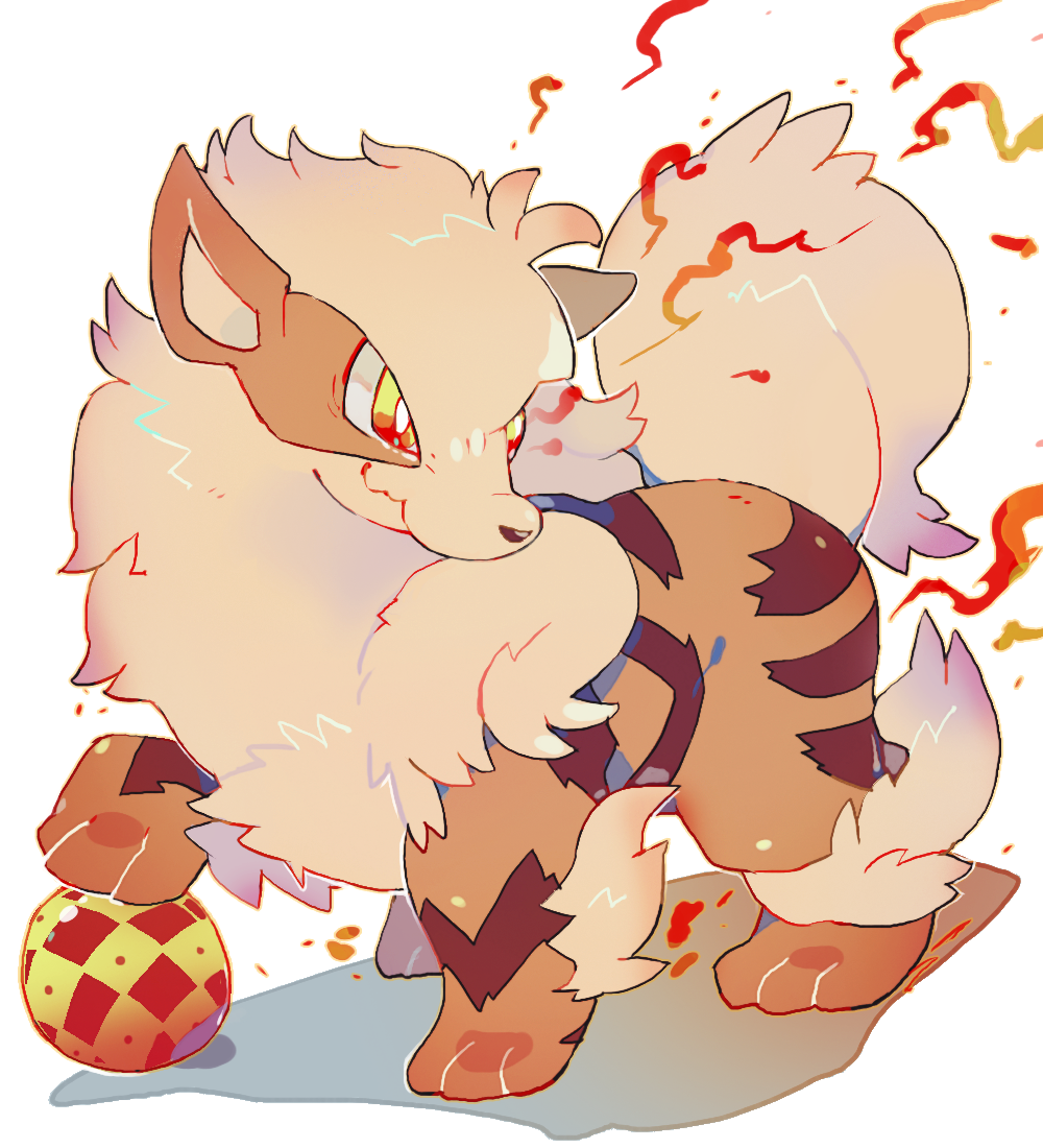 akadako animal_focus arcanine bags_under_eyes ball bright_pupils closed_mouth fire fluffy full_body gen_1_pokemon looking_to_the_side neck_fur nintendo no_humans one-hour_drawing_challenge orange_eyes pokemon pokemon_(creature) simple_background solo standing white_background white_pupils
