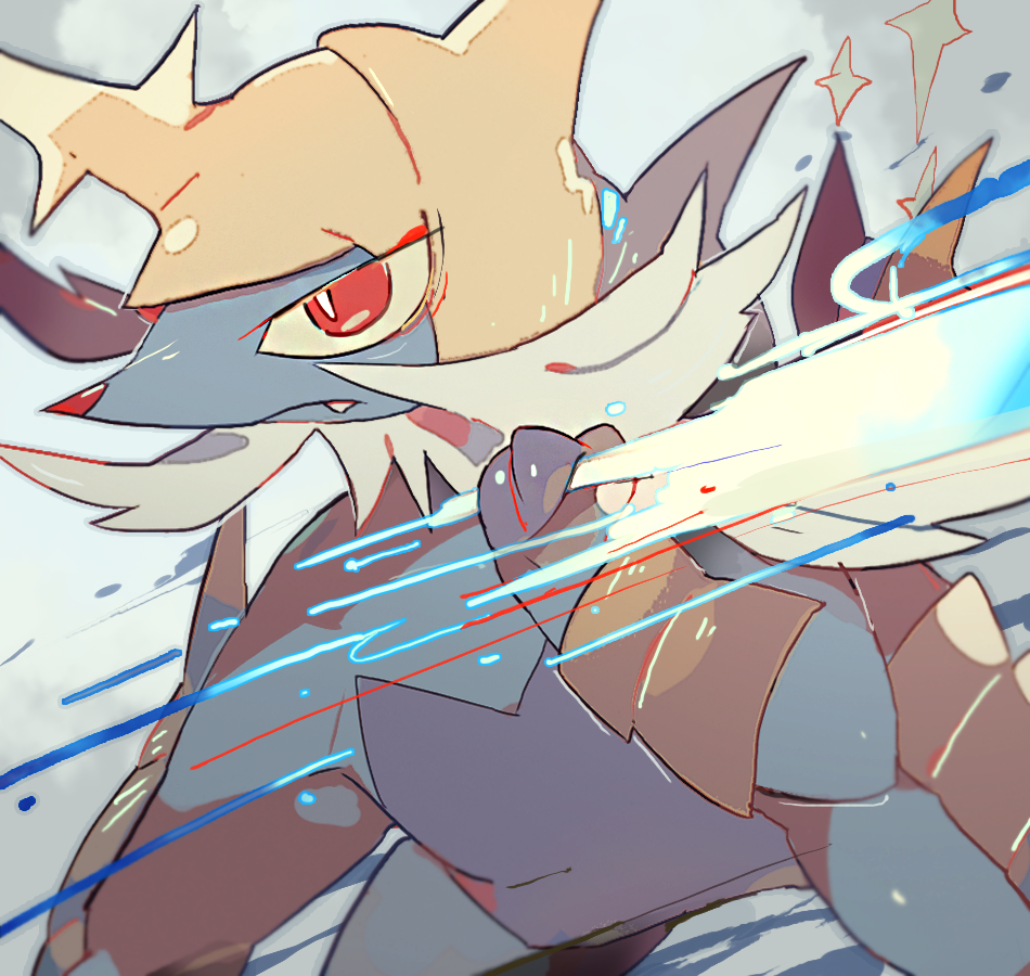 akadako animal_focus bags_under_eyes beard bright_pupils closed_mouth facial_hair fang fang_out gen_5_pokemon grey_background grey_outline hand_up holding holding_weapon light_trail looking_afar mustache nintendo no_humans one-hour_drawing_challenge outline pokemon pokemon_(creature) red_eyes samurott serious solo standing weapon white_pupils