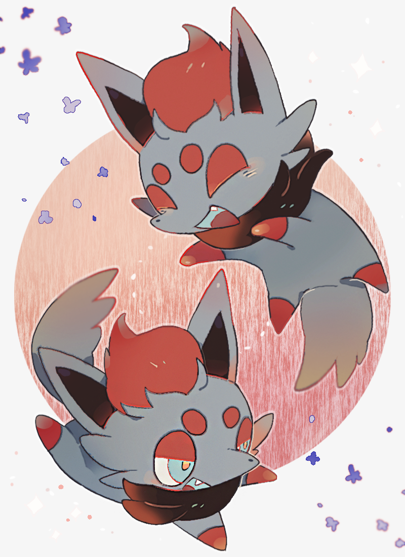 ^_^ akadako animal_focus bags_under_eyes blue_eyes blush closed_eyes fang full_body gen_5_pokemon half-closed_eyes happy light_blush neck_fur nintendo no_humans one-hour_drawing_challenge open_mouth orange_pupils outline pokemon pokemon_(creature) red_background red_hair short_hair smile thick_eyebrows zorua