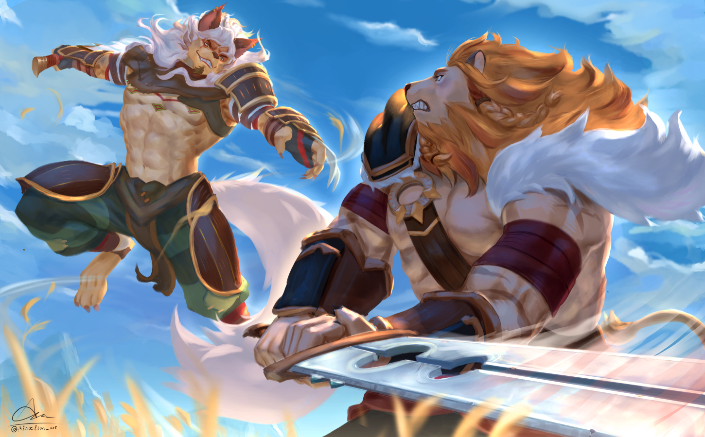 2boys abs afk_(series) afk_journey animal_ears bara barefoot blue_sky braid brutus_(afk_arena) claw_(weapon) claws clenched_teeth cloud cloudy_sky commentary english_commentary facial_hair fangs fighting furry furry_male goatee hinnab_art holding holding_sword holding_weapon lion_boy lion_ears lion_mane lion_tail male_focus multiple_boys muscular muscular_male pectorals shakir_(afk_journey) signature sky smile sword tail teeth twitter_username weapon wolf_boy wolf_ears wolf_tail