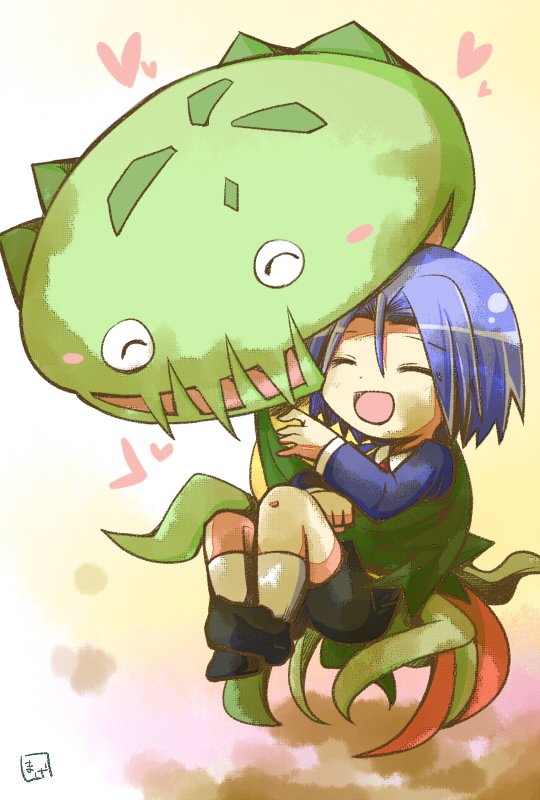 1boy aged_down black_shorts blue_hair carnivine carrying chibi closed_eyes gen_4_pokemon happy heart james_(pokemon) kamille0005 nintendo open_mouth pokemon pokemon_(anime) pokemon_(creature) pokemon_the_series:_diamond_and_pearl princess_carry shorts socks white_socks yellow_background