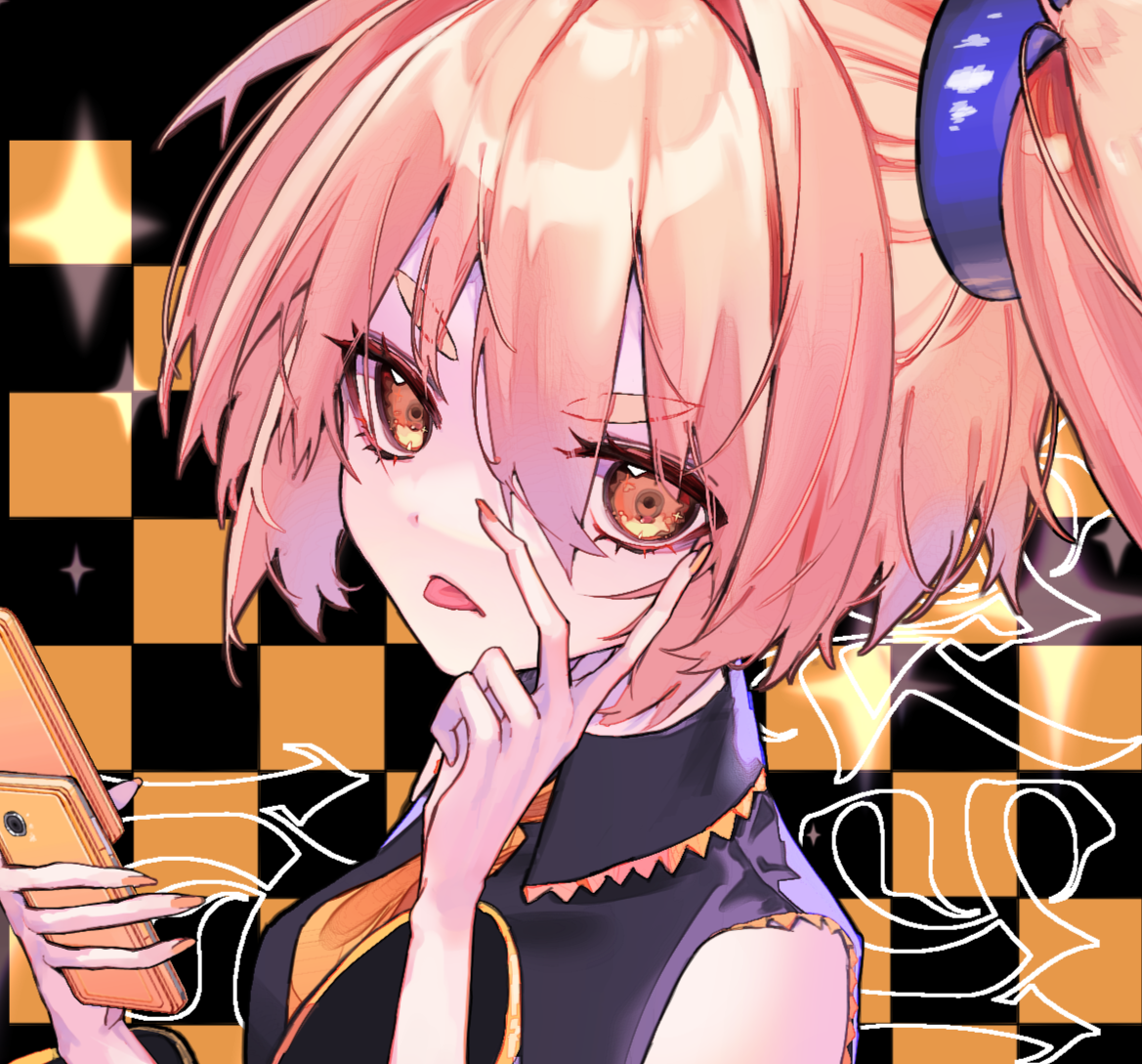 1girl akita_neru bad_anatomy bad_hands black_shirt blonde_hair breasts cellphone checkered_background flip_phone gold_trim hair_between_eyes holding holding_phone medibang_paint_(medium) necktie phone piz_doll portrait shirt side_ponytail small_breasts solo thick_eyebrows tongue tongue_out vocaloid yellow_eyes yellow_nails yellow_necktie