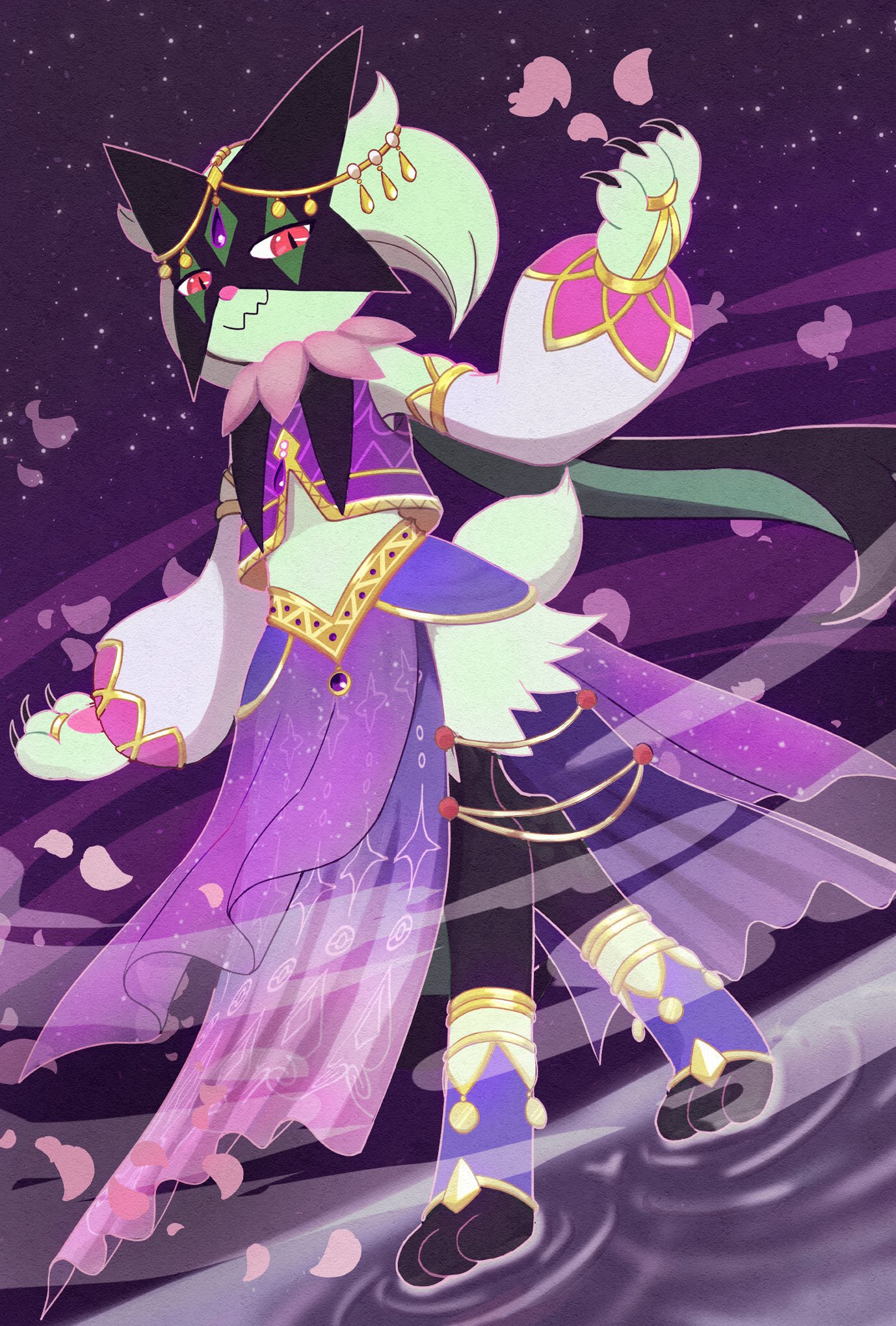 bbbeee88 cape claws furry green_hair highres legs mask meowscarada meowscarada_(dancer) nintendo petals pink_eyes pokemon pokemon_(creature) pokemon_unite slit_pupils smile solo standing tail walking wavy_mouth