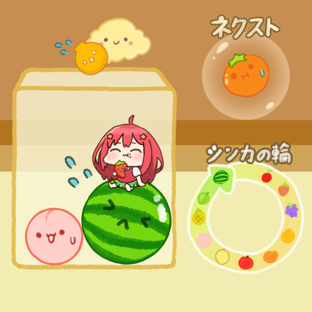 >_< 1girl :< :t akino_ell apple arrow_(symbol) barefoot blush cantaloupe cherry chibi closed_eyes closed_mouth collared_shirt dekopon_(fruit) eating flying_sweatdrops food food_on_face fruit go-toubun_no_hanayome grapes green_skirt hair_ornament holding holding_food long_hair melon nakano_itsuki nashi_pear peach persimmon pineapple pleated_skirt red_hair shirt short_sleeves sitting skirt solo star_(symbol) star_hair_ornament strawberry suika_game sweater_vest translation_request very_long_hair watermelon wavy_mouth white_shirt