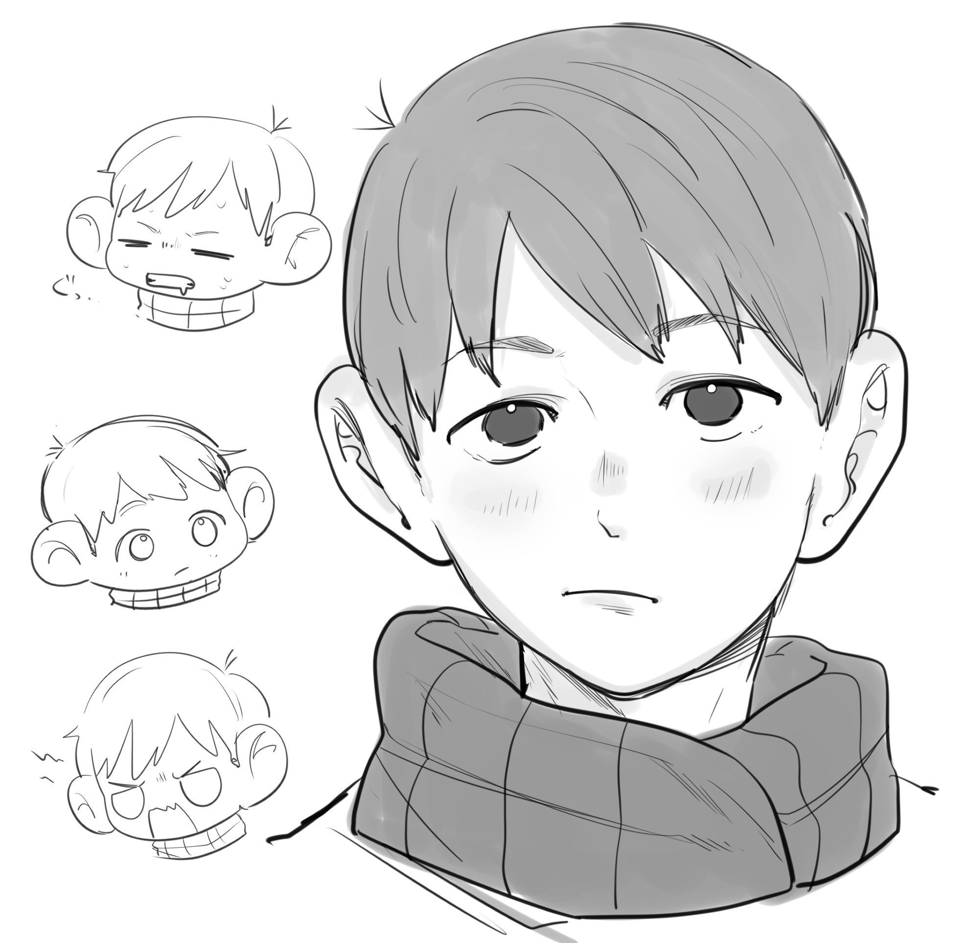 1boy chilchuck_tims closed_mouth dungeon_meshi greyscale highres looking_at_viewer male_focus monochrome multiple_views neck_warmer nemnem_11199 portrait short_hair simple_background very_short_hair white_background
