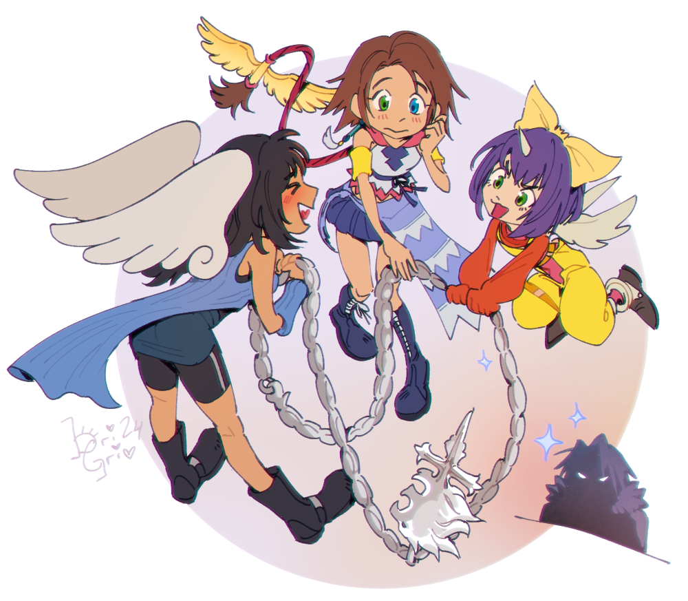 >_< 1boy 3girls alternate_costume black_hair boots bri_(brigriv) brown_hair eiko_carol fairy final_fantasy final_fantasy_ix final_fantasy_viii final_fantasy_x final_fantasy_x-2 glaring green_eyes in-franchise_crossover jewelry kingdom_hearts kingdom_hearts_ii leaning_forward mini_person minigirl multiple_girls necklace official_alternate_costume ponytail purple_hair rinoa_heartilly shaded_face shorts shorts_under_skirt skirt smile squall_leonhart wings yuna_(ff10)