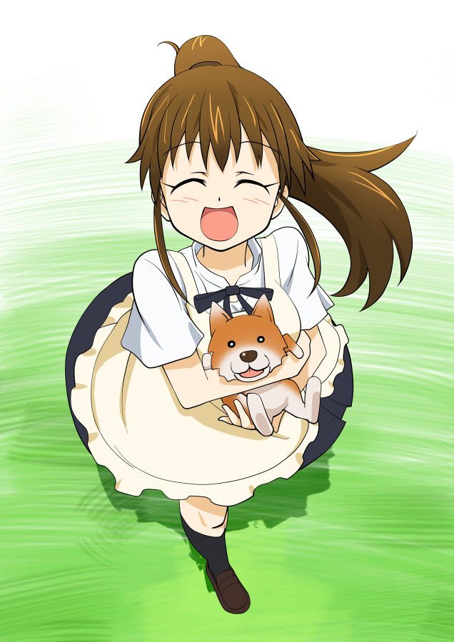 1girl apron baby_animal blush breasts brown_hair closed_eyes dog female_focus gradient_background hug kayaku_(banban) long_hair open_mouth ponytail puppy skirt smile solo taneshima_popura very_long_hair waitress working!!