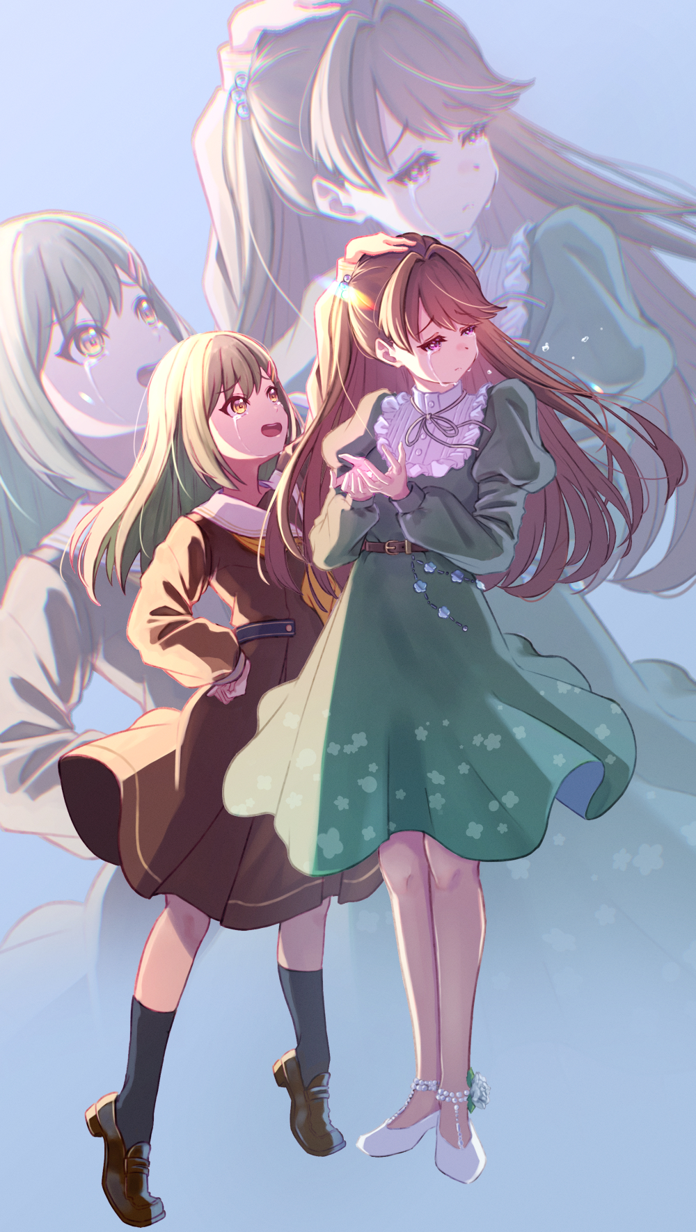 2girls ankle_socks averting_eyes black_socks brown_dress brown_hair brown_shoes closed_mouth collared_dress commentary_request crying crying_with_eyes_open dakishimeru_hanabira_(love_live!) dress frilled_dress frills fujishima_megumi green_dress green_hair grey_background grey_ribbon hair_intakes hair_ornament hairclip hand_on_own_hip hands_up hasu_no_sora_school_uniform headpat height_difference highres juliet_sleeves link!_like!_love_live! loafers long_hair long_sleeves looking_to_the_side love_live! macken666 medium_dress multiple_girls neck_ribbon neckerchief ogami_sachi open_mouth partial_commentary pleated_dress puffy_sleeves purple_eyes ribbon sad sailor_collar sailor_dress school_uniform shoes simple_background smile socks standing straight_hair streaming_tears swept_bangs tears tiptoes two_side_up virtual_youtuber water_drop white_footwear white_sailor_collar winter_uniform yellow_eyes yellow_neckerchief zoom_layer