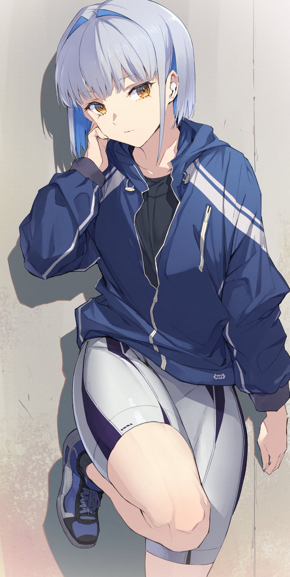 1girl 3s_(tarariko) bike_shorts black_shirt blue_hair blue_jacket collarbone copyright_request earbuds earphones foot_against_wall hand_on_own_cheek hand_on_own_face highres jacket looking_at_viewer medium_hair partially_unzipped shirt shoes sneakers solo yellow_eyes