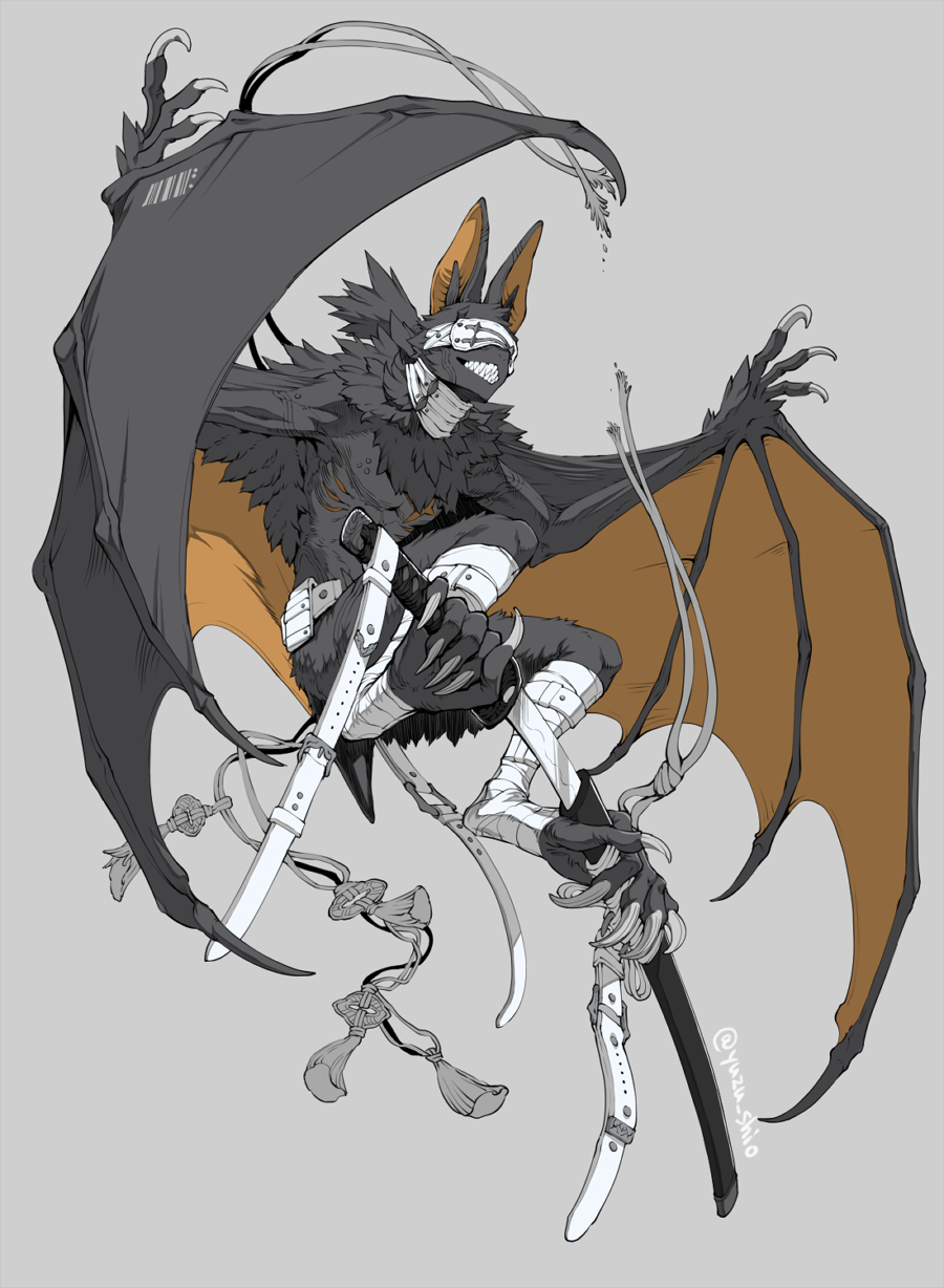 1boy animal_ears bandaged_leg bandages bat_boy bat_ears bat_wings belt black_fur blindfold body_fur claws commentary covered_eyes digitigrade full_body furry furry_male grey_background grin highres holding holding_sword holding_weapon holding_with_feet katana male_focus original sharp_teeth signature simple_background smile solo sword tassel teeth twitter_username weapon winged_arms wings yuzu_shio