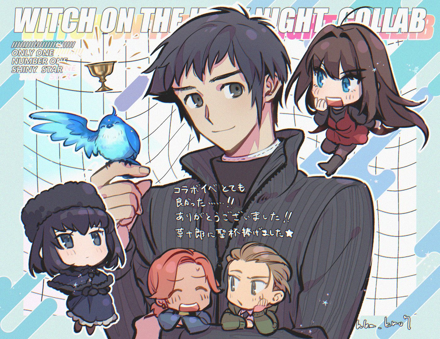 2girls 3boys ahoge aozaki_aoko artist_name bird bird_on_hand black_dress black_eyes black_hair black_jacket blue_eyes brown_hair chibi dress fate/grand_order fate_(series) hat hka_kr07 holy_grail_(fate) jacket kinomi_housuke kuonji_alice long_hair mahou_tsukai_no_yoru multiple_boys multiple_girls orange_hair robin_(bird) shizuki_soujuurou smile tsukiji_tobimaru