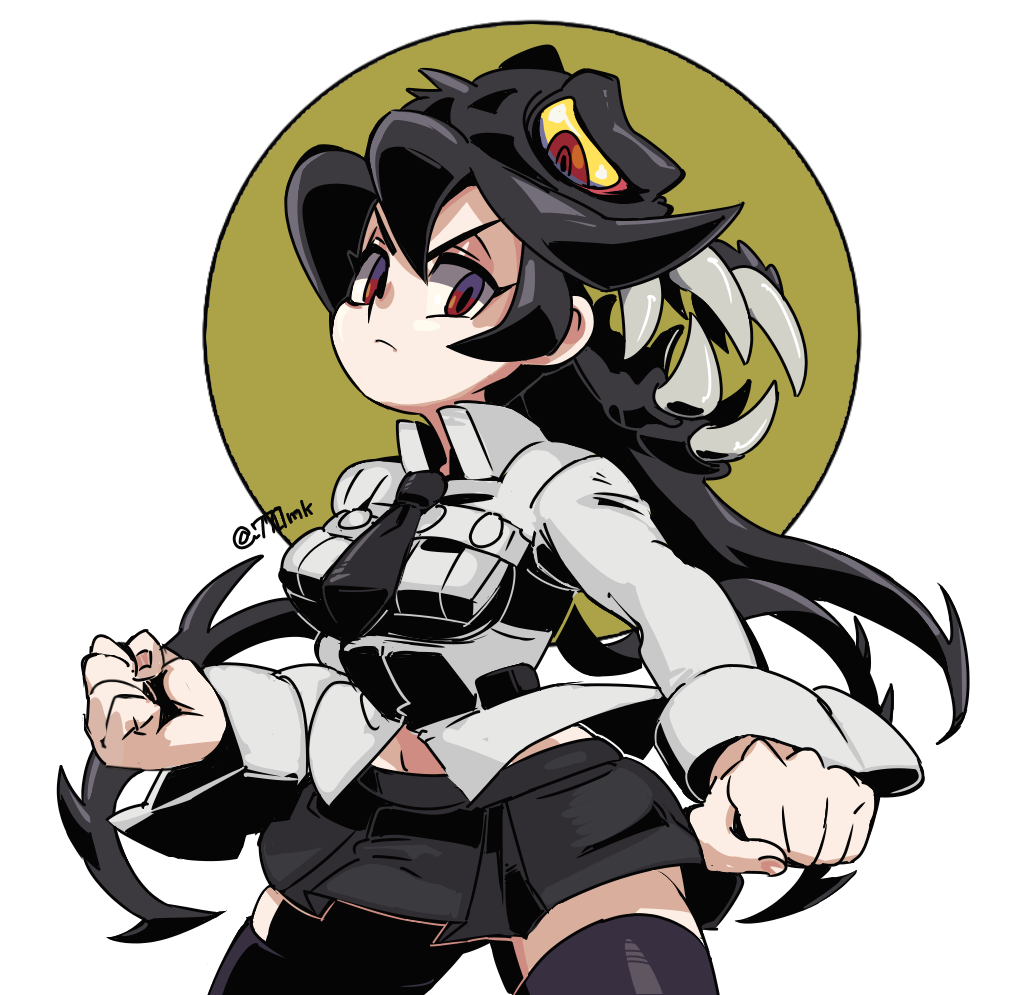1girl 770mk black_hair clenched_hands fighting_stance filia_(skullgirls) frown looking_at_viewer navel necktie pleated_skirt red_eyes samson_(skullgirls) school_uniform sharp_teeth skirt skullgirls solo teeth thighhighs white_background