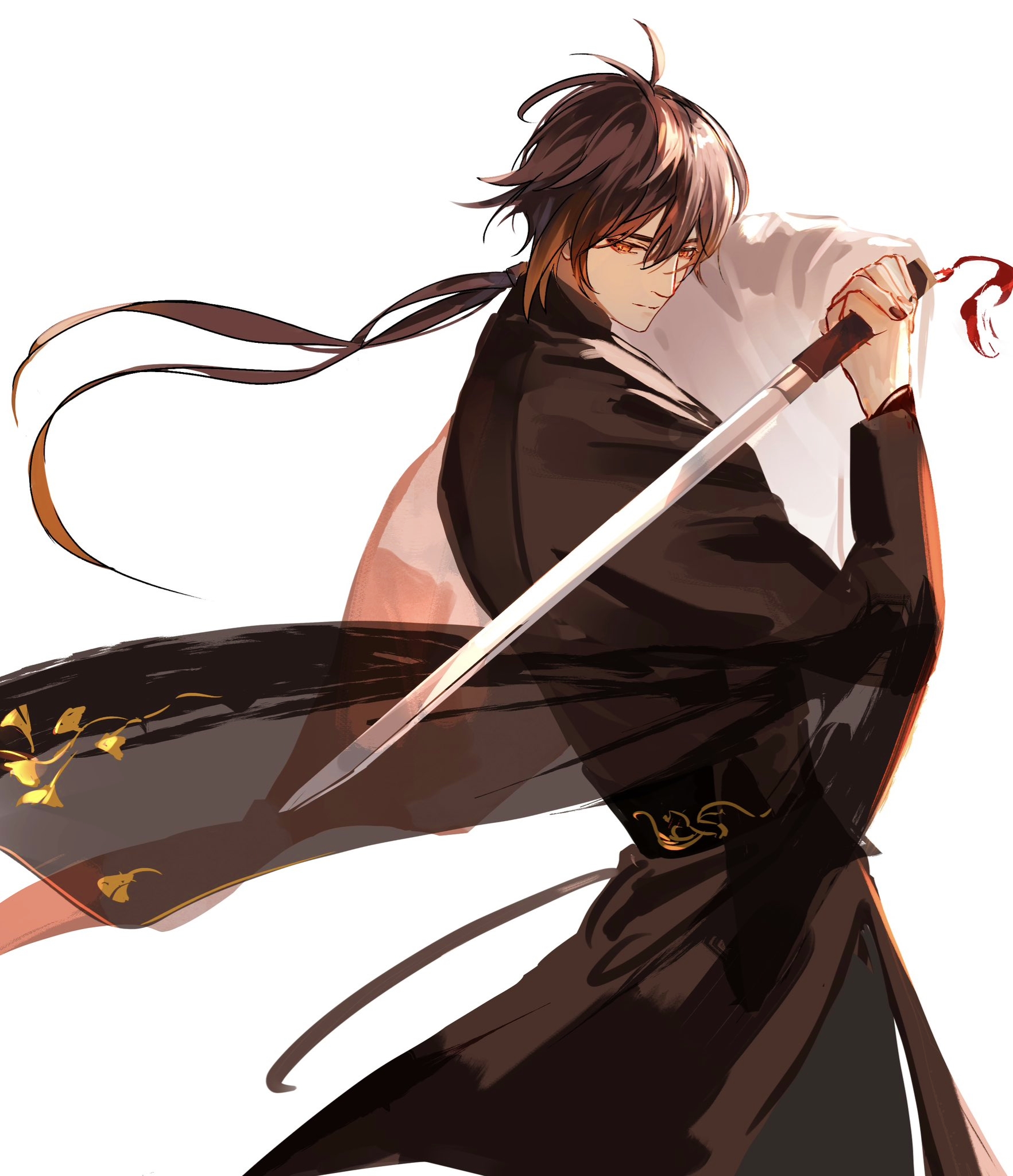 1boy chinese_clothes genshin_impact hanfu highres holding holding_weapon ntk_jz solo sword twitter weapon white_background zhongli_(genshin_impact)