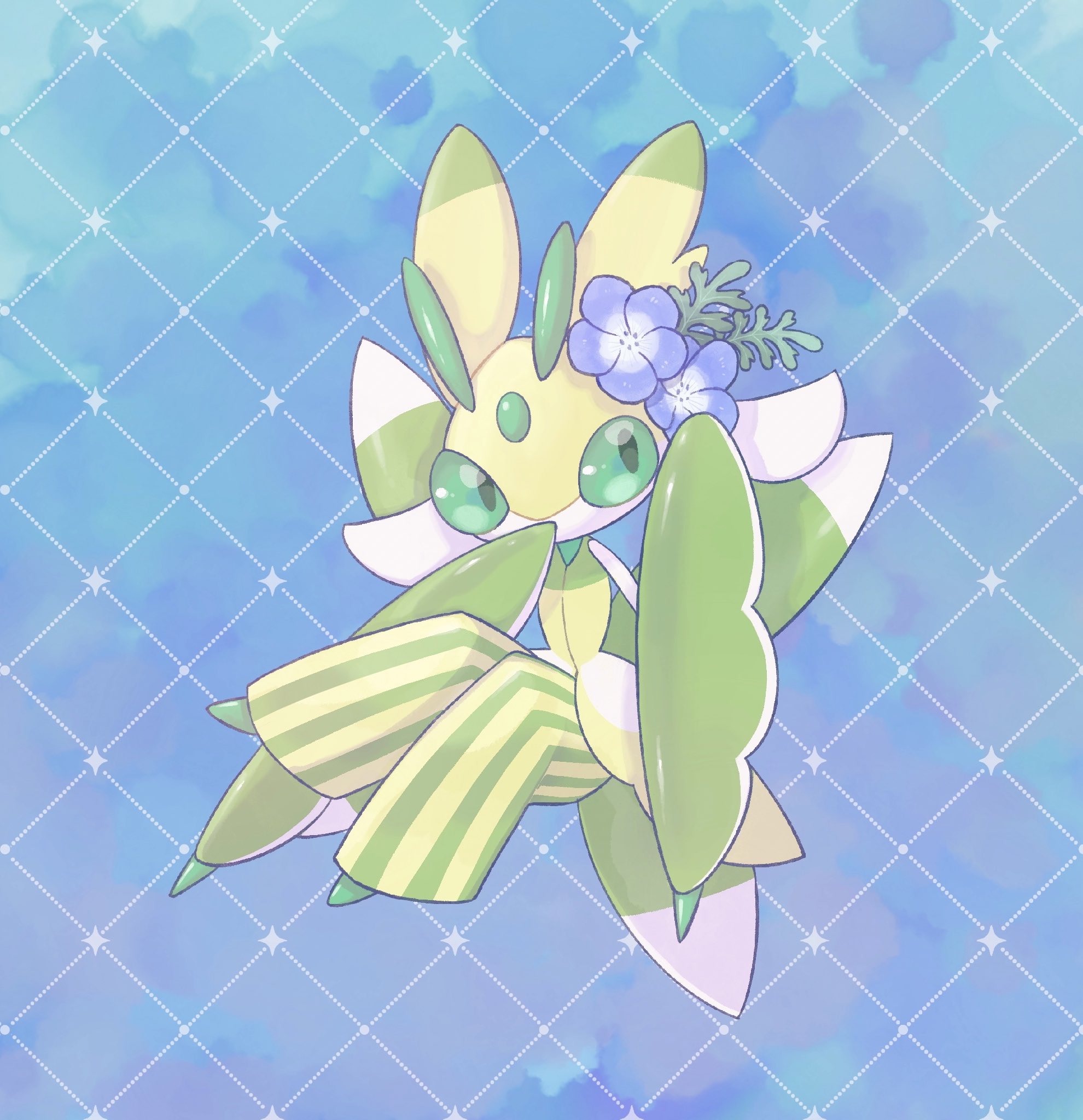 alternate_color blue_background claws commentary flower full_body gen_7_pokemon green_eyes hand_up highres looking_to_the_side lurantis mozu_(teluto) nintendo pokemon pokemon_(creature) purple_flower shiny_pokemon solo untranslatable_commentary