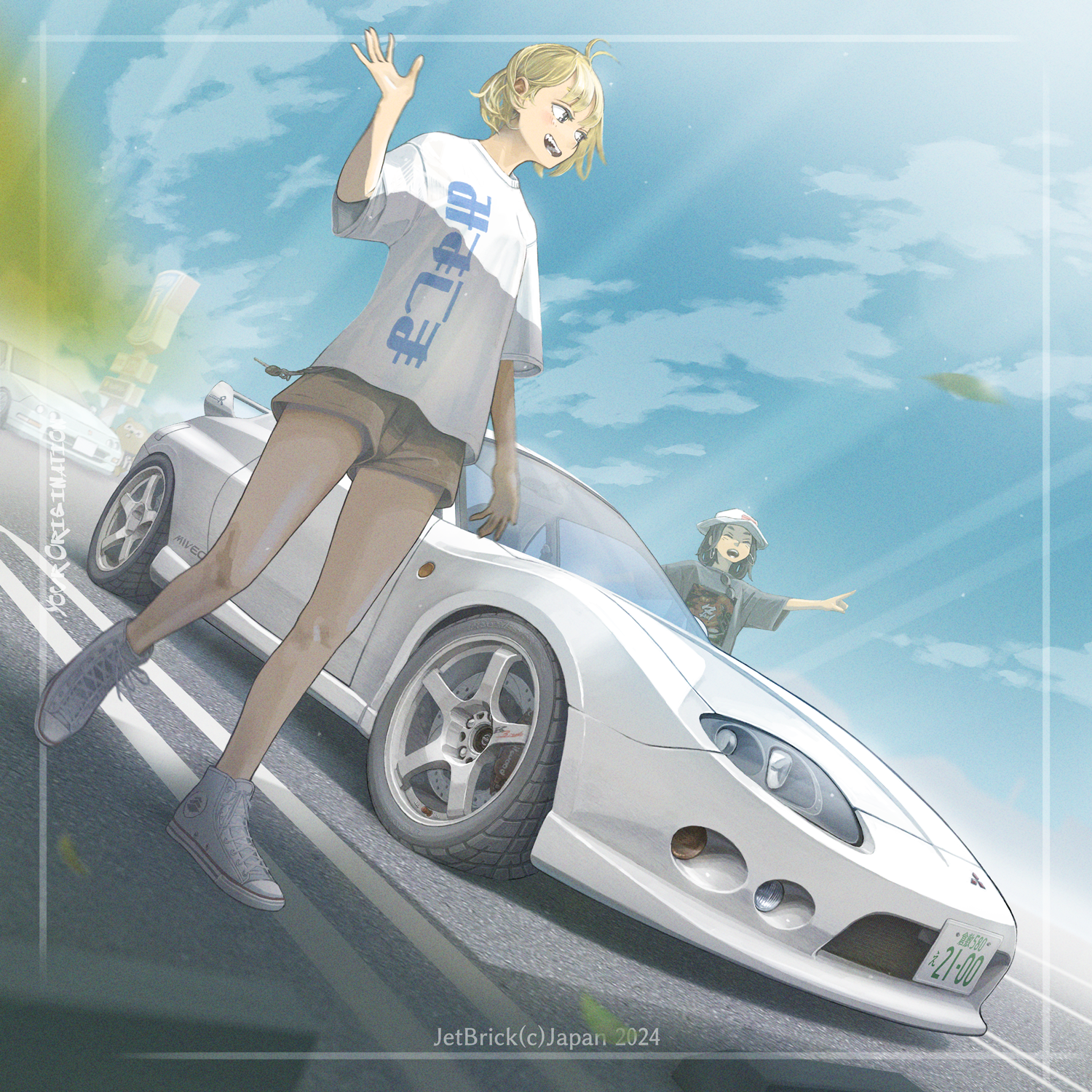 2girls black_eyes blonde_hair blue_sky brown_shorts car closed_eyes cloud day dutch_angle facing_another grey_shirt hat highres jettoburikku looking_at_another mitsubishi_fto mitsubishi_motors motor_vehicle multiple_girls open_mouth original outdoors parking_lot pointing shirt shoes short_hair short_sleeves shorts sky sneakers sports_car t-shirt teeth white_car white_footwear white_hat white_shirt wide_sleeves
