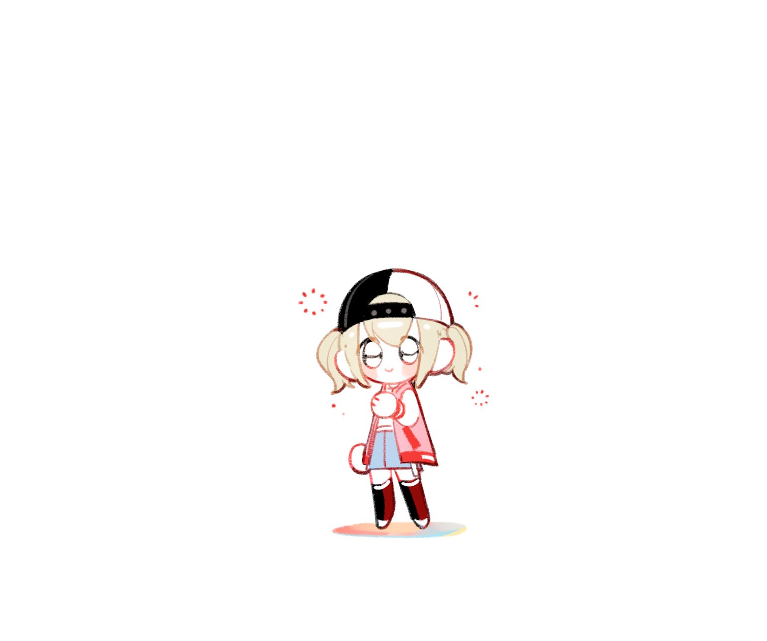 1girl azusawa_kohane black_hat black_socks blonde_hair chibi hat highres jacket long_sleeves looking_at_viewer pink_jacket project_sekai short_twintails sim_0204 simple_background smile socks solo twintails white_background