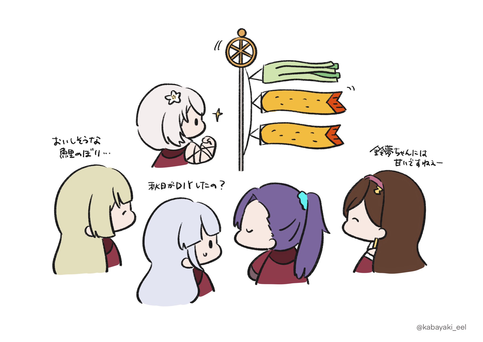 5girls ^_^ aqua_scrunchie assault_lily asymmetrical_bangs blonde_hair blunt_bangs brown_hair brown_sailor_collar closed_eyes cropped_torso detached_sleeves earrings flower grey_hair hair_flower hair_ornament hair_over_shoulder hair_scrunchie hairband hand_up high_ponytail highres honma_akehi ishizuka_fujino jewelry kabayaki_(kabayaki_eel) kanba_girls_high_school_uniform koinobori kon_kanaho layered_sleeves long_hair long_sleeves looking_at_another looking_at_object miyagawa_takane motion_lines multiple_girls no_mouth pink_hairband ponytail profile purple_hair red_shirt sailor_collar school_uniform scrunchie serafuku shiozaki_suzume shirt short_sleeves side_ponytail simple_background solid_oval_eyes sparkle sweatdrop translated white_background white_flower windsock