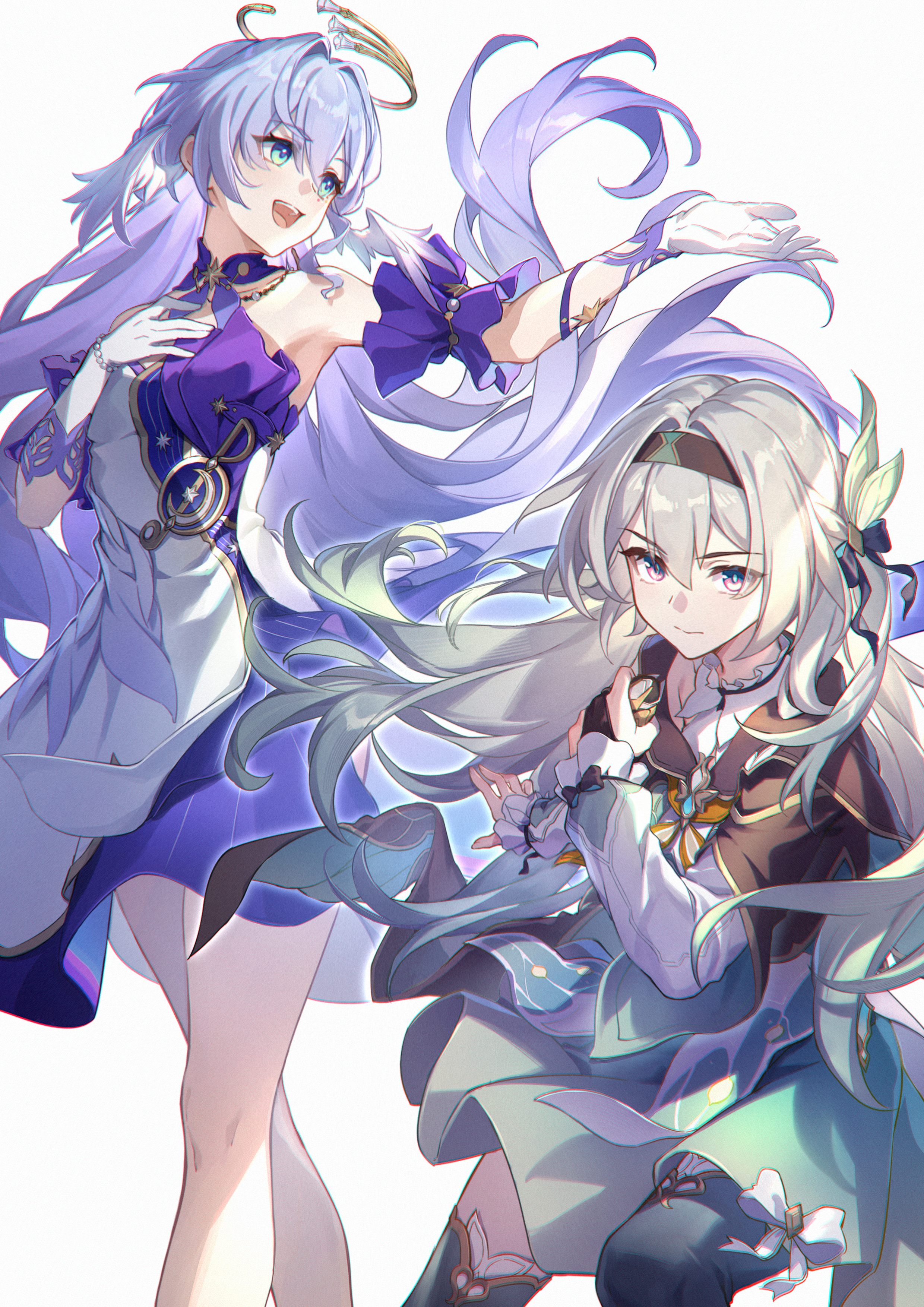 2girls absurdres aqua_skirt bead_bracelet beads black_hairband black_jacket blue_pupils bow bracelet bridal_gauntlets choker clenched_hand collar cropped_jacket dress feather_boa firefly_(honkai:_star_rail) fireworks gloves grey_hair hair_intakes hairband halo halo_behind_head hand_on_own_chest head_wings highres honkai:_star_rail honkai_(series) jacket jewel_under_eye jewelry looking_afar looking_at_viewer multicolored_eyes multiple_girls neckerchief open_mouth orange_neckerchief pearl_bracelet purple_choker purple_collar purple_dress purple_sleeves robin_(honkai:_star_rail) shirt simple_background single_bridal_gauntlet skirt sparkler strapless strapless_dress two-tone_eyes vuvkhkgi white_background white_bow white_dress white_gloves white_shirt white_wings wings yellow_neckerchief