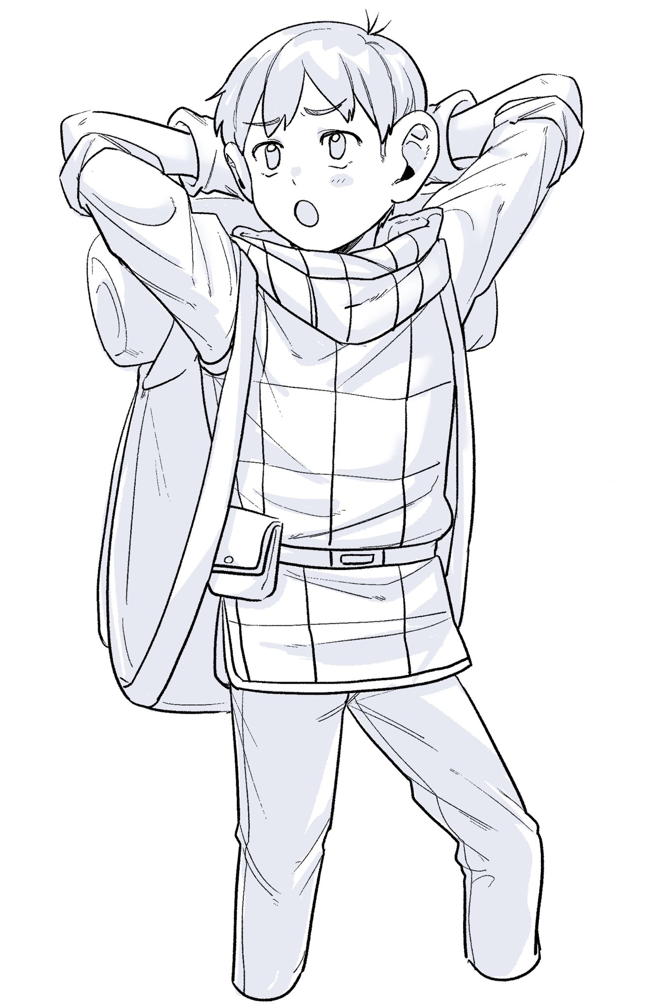 1boy :o arms_behind_head backpack bag chilchuck_tims cropped_legs dungeon_meshi gloves greyscale highres male_focus monochrome neck_warmer nemnem_11199 open_mouth pants short_hair simple_background solo very_short_hair vest white_background
