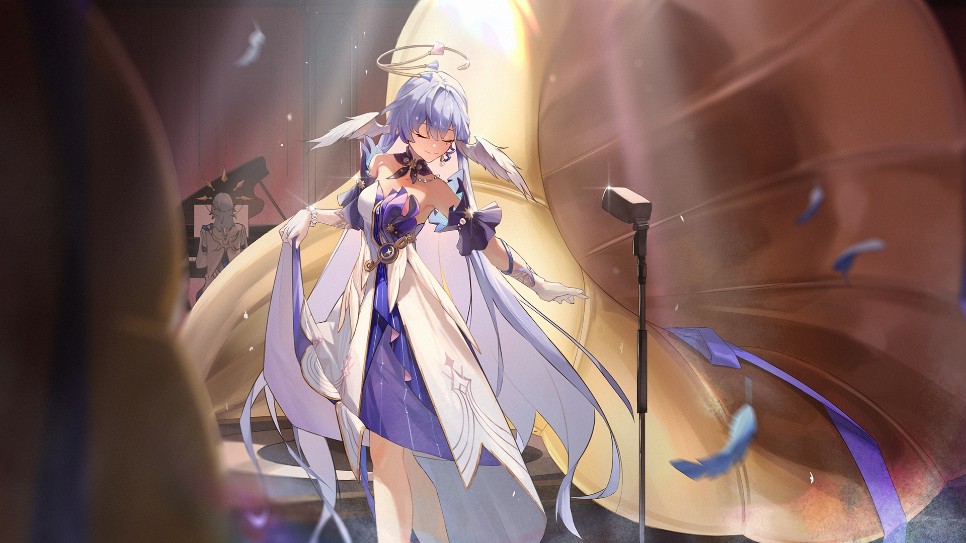 1boy 1girl bare_shoulders bird_wings blurry blurry_foreground bracelet closed_eyes colored_inner_hair concert daidaiseng depth_of_field detached_collar detached_sleeves dress earrings facial_mark facing_viewer falling_feathers feathers feet_out_of_frame glint gloves halo head_wings highres holding_own_dress honkai:_star_rail honkai_(series) indoors instrument jewelry light_rays long_hair microphone_stand multicolored_hair phonograph piano purple_hair robin_(honkai:_star_rail) single_earring single_glove smile solo_focus standing strapless strapless_dress sunday_(honkai:_star_rail) sunday_(sacerdos'_relived_ordeal)_(honkai:_star_rail) white_dress white_gloves white_wings wings