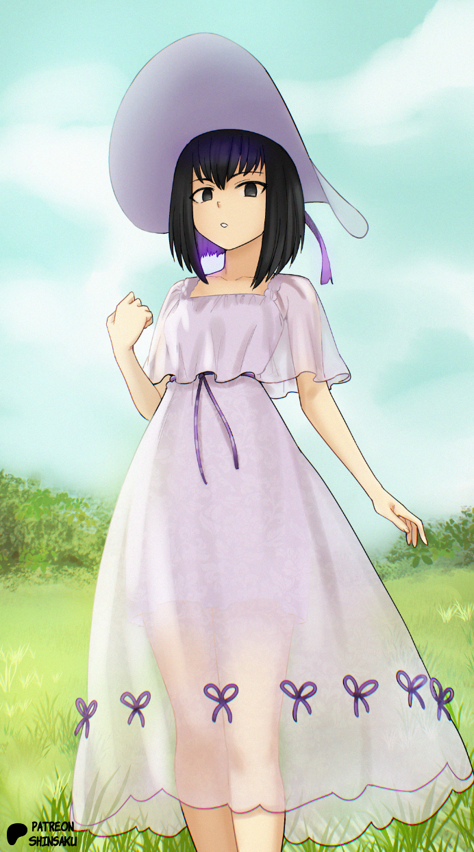 1girl black_eyes black_hair breasts dress fate/grand_order fate_(series) hat highres kuonji_alice looking_at_viewer mahou_tsukai_no_yoru medium_breasts shinsaku_(stan-art) short_hair solo sun_hat white_dress