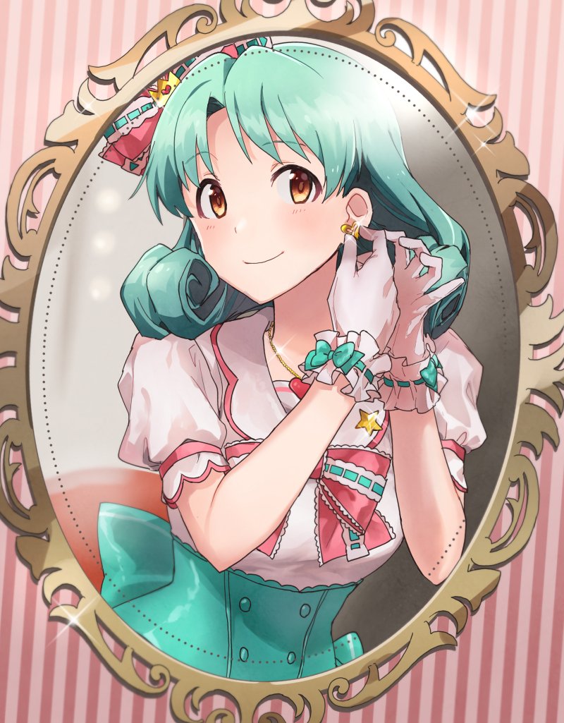 1girl blurry blush bow bowtie breasts brown_eyes closed_mouth corset curly_hair depth_of_field dot_nose dress_bow earphones glint gloves green_bow green_corset green_hair hair_bow hair_ribbon hands_up heart heart_necklace holding holding_earphones idolmaster idolmaster_million_live! idolmaster_million_live!_theater_days jewelry looking_at_mirror medium_breasts mirror necklace parted_bangs pink_bow pink_bowtie puffy_short_sleeves puffy_sleeves red_ribbon ribbon shirop_imas shirt short_hair short_sleeves smile solo tokugawa_matsuri underbust upper_body white_gloves white_shirt