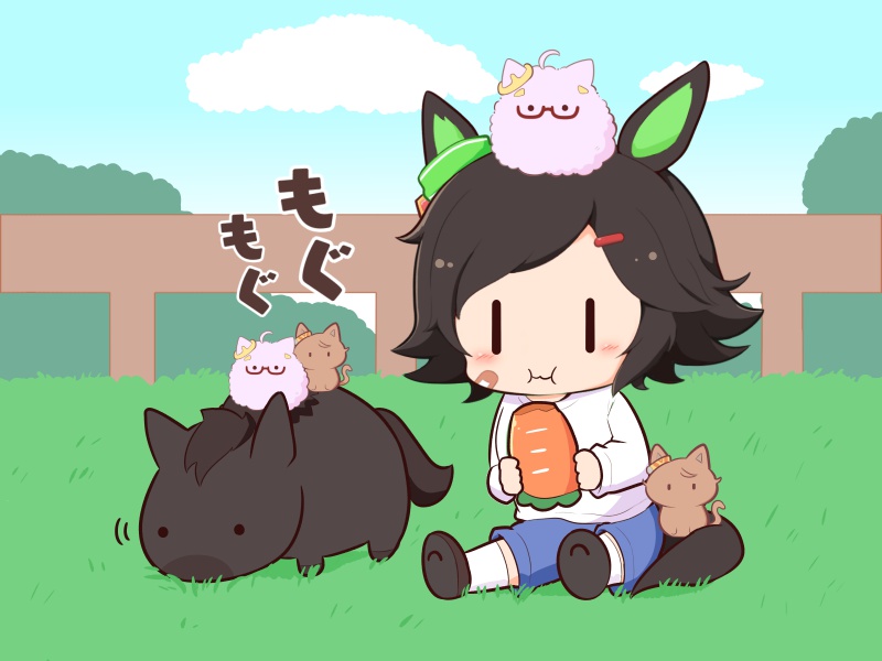 1girl :i ahoge animal animal_ears animalization bandaid bandaid_on_cheek bandaid_on_face biwa_hayahide_(umamusume) black_footwear black_hair blue_shorts blue_sky blush_stickers carrot cat chibi closed_mouth cloud creature_and_personification day eating fence food glasses gomashio_(goma_feet) grass hair_ornament hairclip holding holding_food horse horse_ears horse_girl horse_tail horseshoe kneehighs narita_taishin_(umamusume) on_ground on_head outdoors personification red-framed_eyewear semi-rimless_eyewear shoe_soles shorts sitting sky socks swept_bangs tail translation_request umamusume under-rim_eyewear wavy_mouth white_socks winning_ticket_(racehorse) winning_ticket_(umamusume) |_|