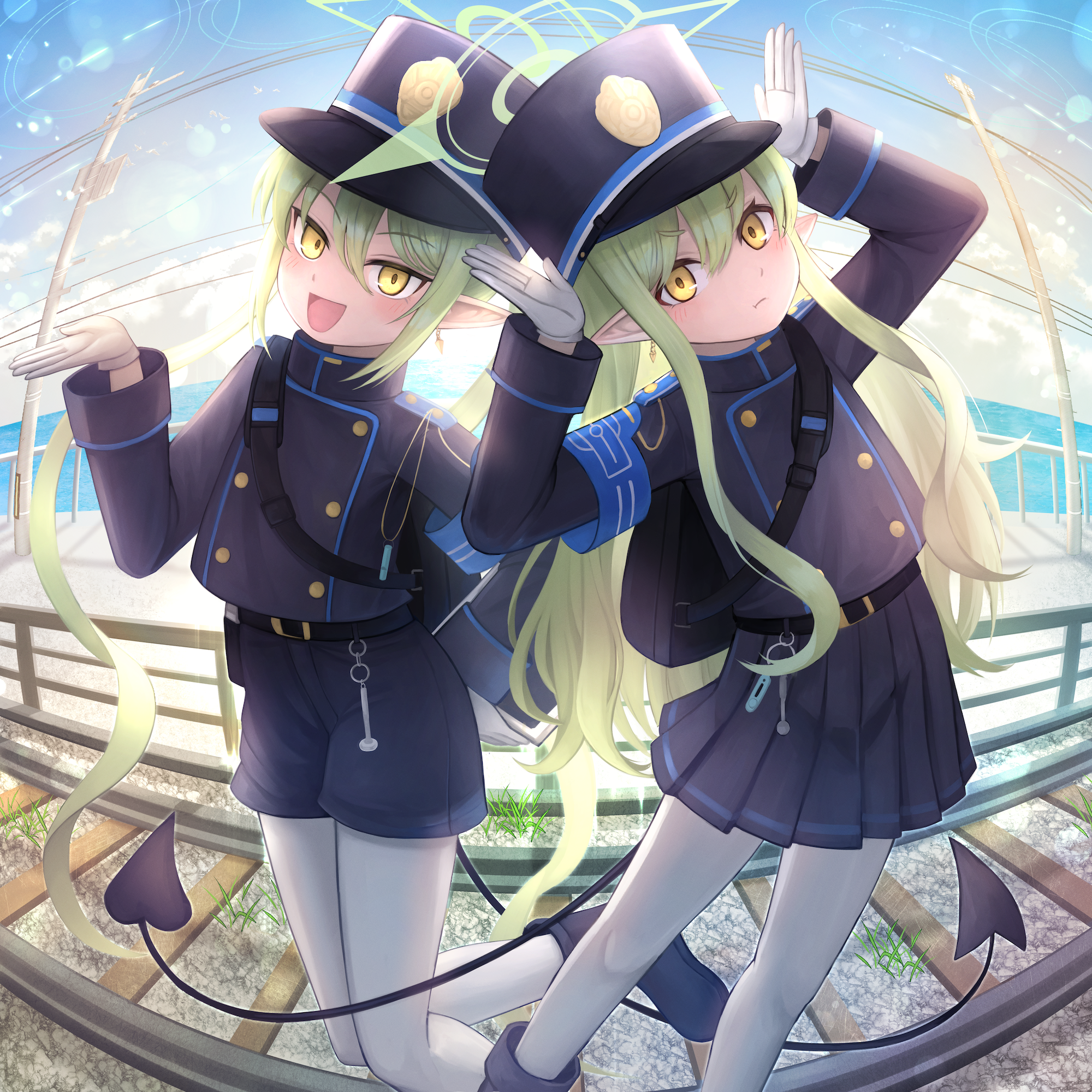 1girl 2girls arm_at_side armband black_footwear black_hat black_jacket black_shorts black_skirt blue_archive blue_armband blue_sky blush boots buttons commentary_request demon_tail double-breasted earrings fisheye gloves green_hair green_halo halo hat highres hikari_(blue_archive) jacket jewelry long_hair long_pointy_ears long_sleeves looking_at_viewer military_uniform miniskirt multiple_girls nozomi_(blue_archive) outdoors pantyhose pantyhose_under_shorts pillbox_hat pleated_skirt pointy_ears rabbit_pose railroad_tracks ruraji shako_cap shorts siblings sisters skirt sky tail tareme tsurime twins twintails white_gloves white_pantyhose yellow_eyes