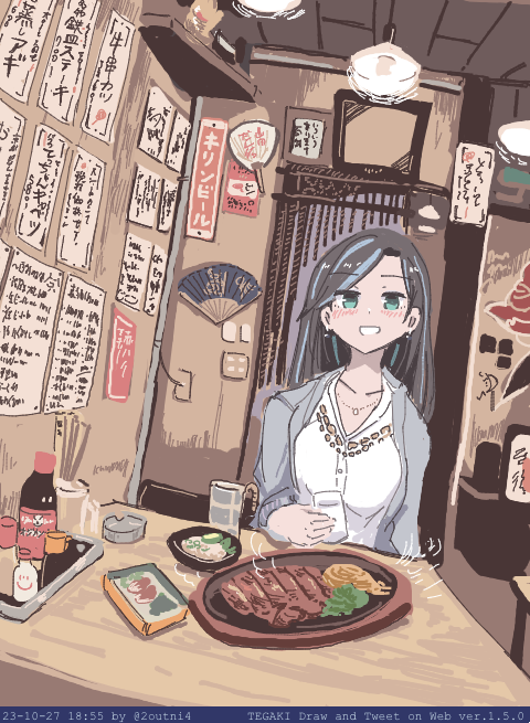 1girl aqua_hair beef black_hair blush bottle cardigan cup food grey_sweater hand_fan jewelry lamp looking_at_viewer mug multicolored_hair necklace nishi_(nishinotes) open_cardigan open_clothes original poster_(object) restaurant shirt sitting smile solo soy_sauce_bottle steam streaked_hair sweater table tegaki_draw_and_tweet white_shirt