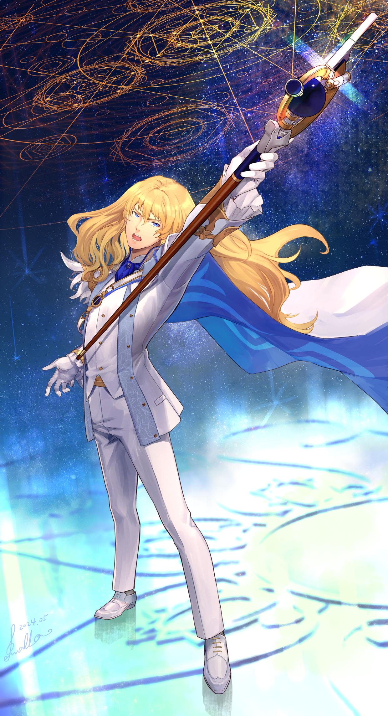 1boy ascot blonde_hair blue_ascot blue_cape blue_eyes buttons cape collared_shirt fate/grand_order fate_(series) formal_clothes gloves hair_between_eyes highres holding holding_staff jacket kirschtaria_wodime long_hair long_sleeves magic_circle open_clothes open_jacket open_mouth pants shirt shoes staff studded_jacket suit swa_(swallow165) two-sided_cape two-sided_fabric white_cape white_gloves white_pants white_shirt white_shoes white_suit