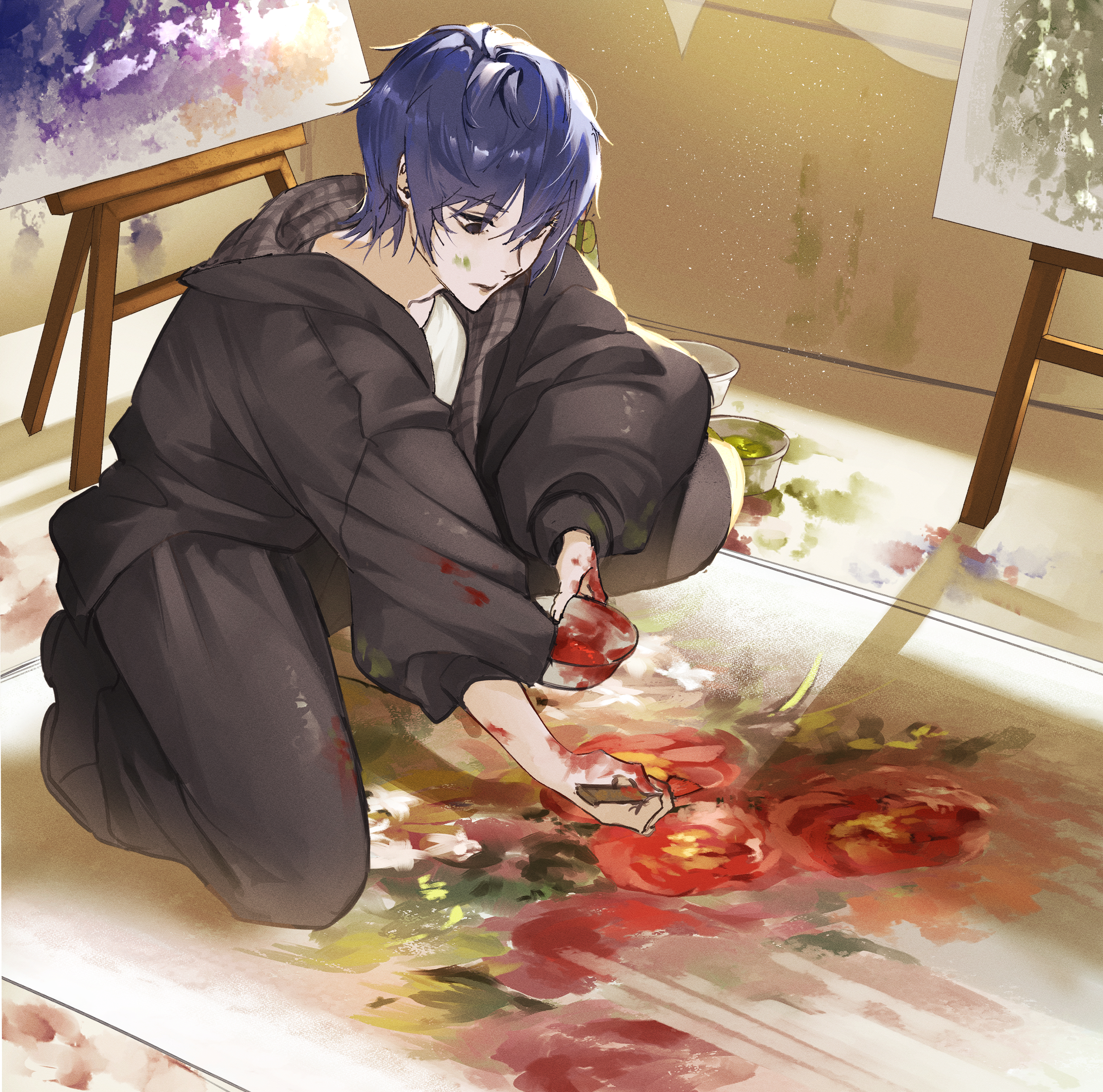 1other absurdres androgynous black_jacket black_pantyhose blue_eyes canvas_(object) character_request closed_mouth commission copyright_request easel highres holding holding_paintbrush jacket kneeling long_sleeves open_clothes open_jacket original paint_stains paintbrush painting_(action) pantyhose purple_hair shirt shoes short_hair solo stained_clothes white_shirt zuraa_(naunau_seijin)