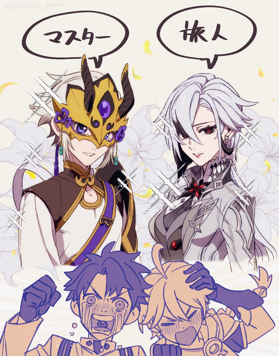 1girl 3boys aether_(genshin_impact) ahoge arlecchino_(genshin_impact) artist_name bishie_sparkle black_eyes black_hair blue_eyes blush chinese_clothes clenched_hand closed_eyes coat commentary crossover crying crying_with_eyes_open falling_feathers fate/grand_order fate_(series) feathers floral_background flower fujimaru_ritsuka_(male) fujimaru_ritsuka_(male)_(decisive_battle_chaldea_uniform) furrowed_brow genshin_impact gloves grey_coat grin hair_between_eyes hand_on_own_head hand_up heart highres horned_mask long_hair long_sleeves looking_at_viewer mask multicolored_hair multiple_boys ponytail prince_of_lan_ling_(fate) purple_sash red_pupils sash sashikomi shirt short_hair short_sleeves shoulder_sash simple_background smile sparkle speech_bubble streaked_hair streaming_tears symbol-shaped_pupils tears translated twitter_username two-tone_hair upper_body v-shaped_eyebrows voice_actor_connection white_hair white_shirt wide-eyed x-shaped_pupils yaoi