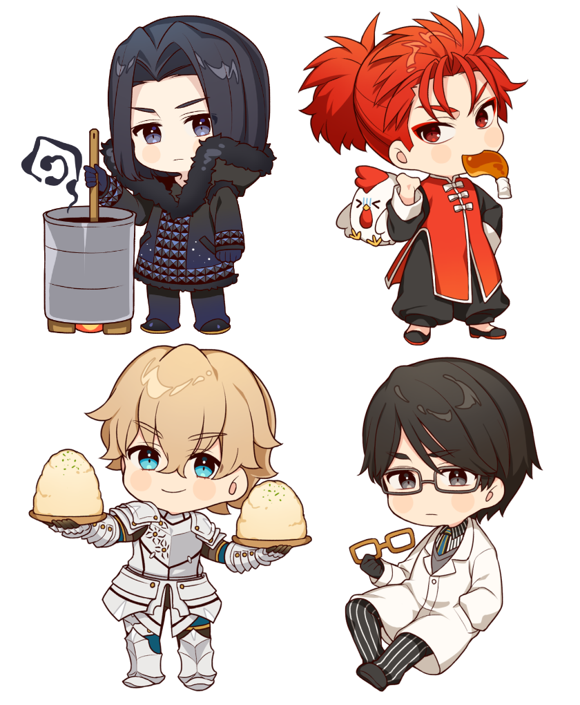 4boys arm_at_side armor armored_boots bird black_coat black_eyes black_footwear black_gloves black_hair black_pants black_shirt blonde_hair blue_eyes blush_stickers boots breastplate cauldron changpao chibi chicken chinese_clothes closed_mouth coat commentary eyeshadow fate/extra fate/extra_ccc fate_(series) faulds food full_body fur-trimmed_coat fur_trim gauntlets gawain_(fate) glasses gloves grey-framed_eyewear grey_vest hair_between_eyes hand_in_pocket hand_on_own_hip hand_up high_collar holding holding_removed_eyewear julius_belkisk_harway karokuchitose li_shuwen_(fate) li_shuwen_(young)_(fate) long_sleeves looking_at_viewer makeup male_focus meat medium_hair multiple_boys pants pauldrons ponytail puffy_pants red_eyes red_eyeshadow red_hair red_shirt shirt short_hair shoulder_armor simple_background smile standing stirring striped_clothes striped_pants striped_shirt twice_h_pieceman unworn_eyewear vertical-striped_clothes vertical-striped_pants vertical-striped_shirt vest white_background white_coat white_pants white_shirt