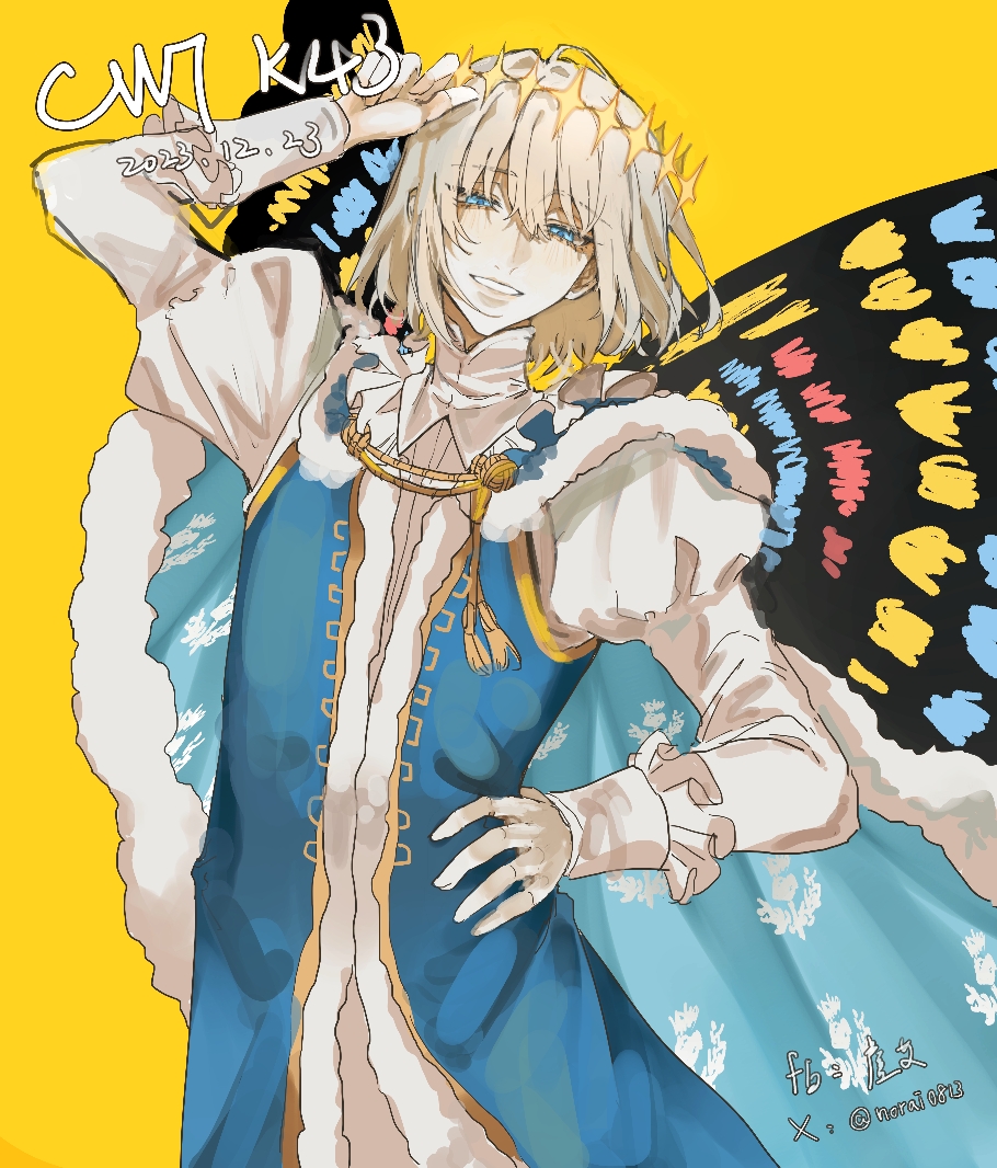 1boy arm_up blonde_hair blue_coat blue_eyes butterfly_wings capelet coat dated diamond_hairband facebook_username fate/grand_order fate_(series) fur-trimmed_capelet fur_trim gloves hair_between_eyes high_collar insect_wings juliet_sleeves long_sleeves norai0813 oberon_(fate) oberon_(first_ascension)_(fate) puffy_sleeves short_hair solo twitter_username white_gloves wings yellow_background