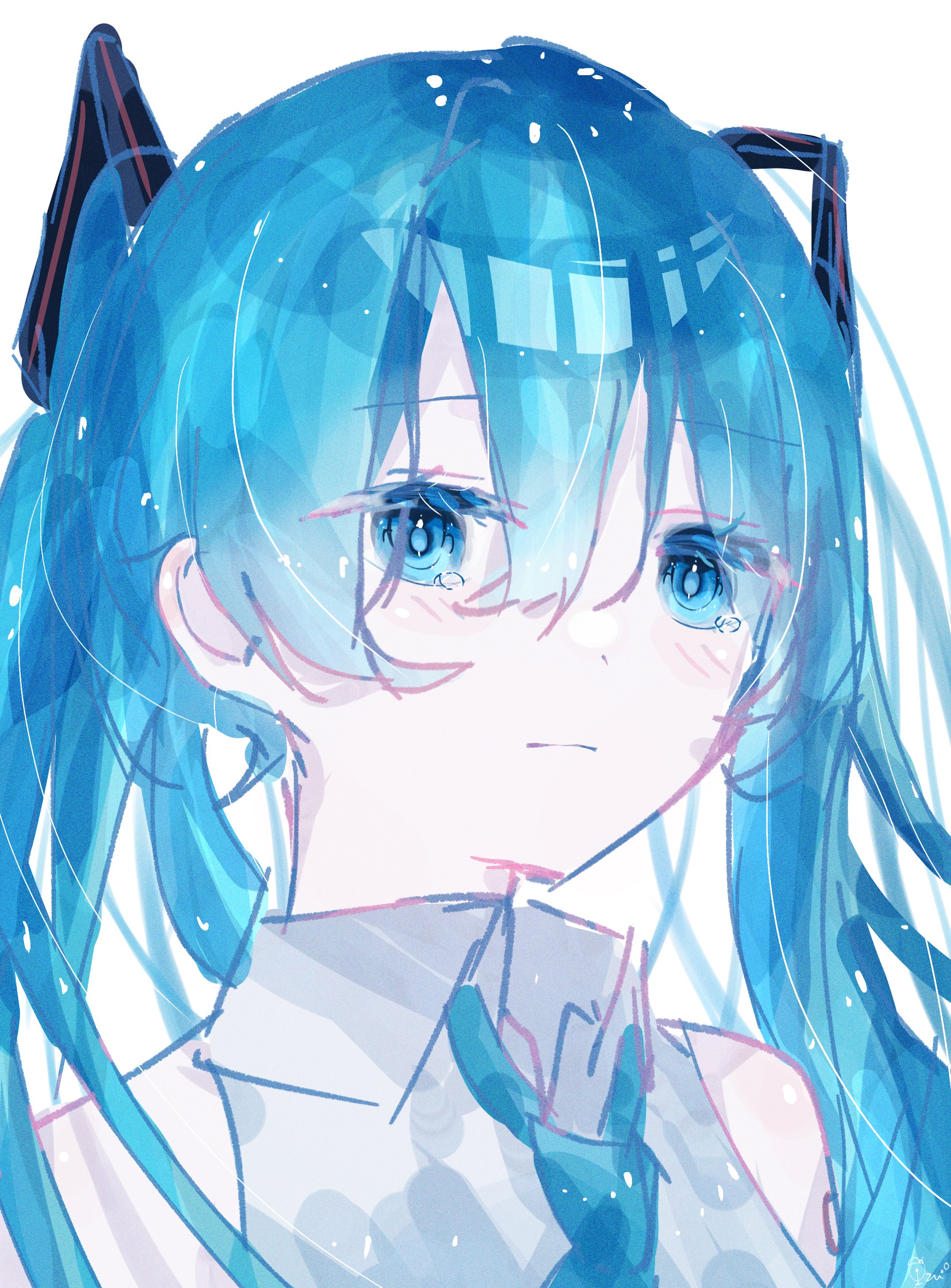 1girl absurdres aqua_eyes aqua_hair aqua_necktie blue_eyes close-up closed_mouth collared_shirt commentary_request dot_nose hair_between_eyes hair_ornament hatsune_miku highres izu_(izu_16016) light_blush long_hair looking_ahead necktie portrait shirt simple_background sleeveless solo tearing_up twintails unkempt vocaloid white_background white_shirt