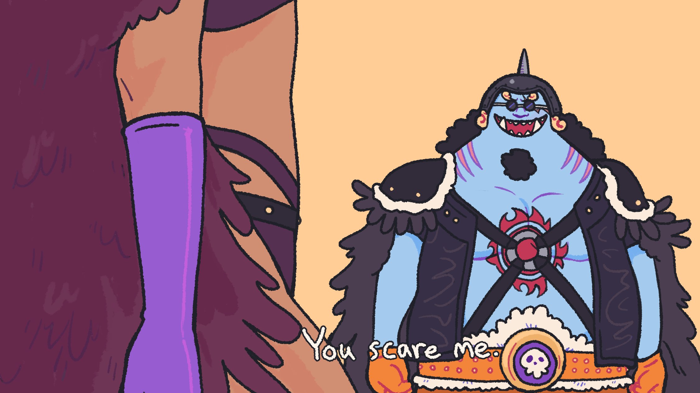 1boy 1girl armor beast_pirates_uniform belt black_hair black_vest blue_skin cape colored_skin commentary derivative_work english_commentary english_text facial_hair fish_boy fur_cape gloves goatee highres jinbe_(one_piece) long_hair natade_art nico_robin nico_robin_(onigashima) one_piece open_mouth orange_background orange_gloves purple_gloves screenshot_redraw sharp_teeth shoulder_armor simple_background smile sunglasses teeth tusks upper_body vest