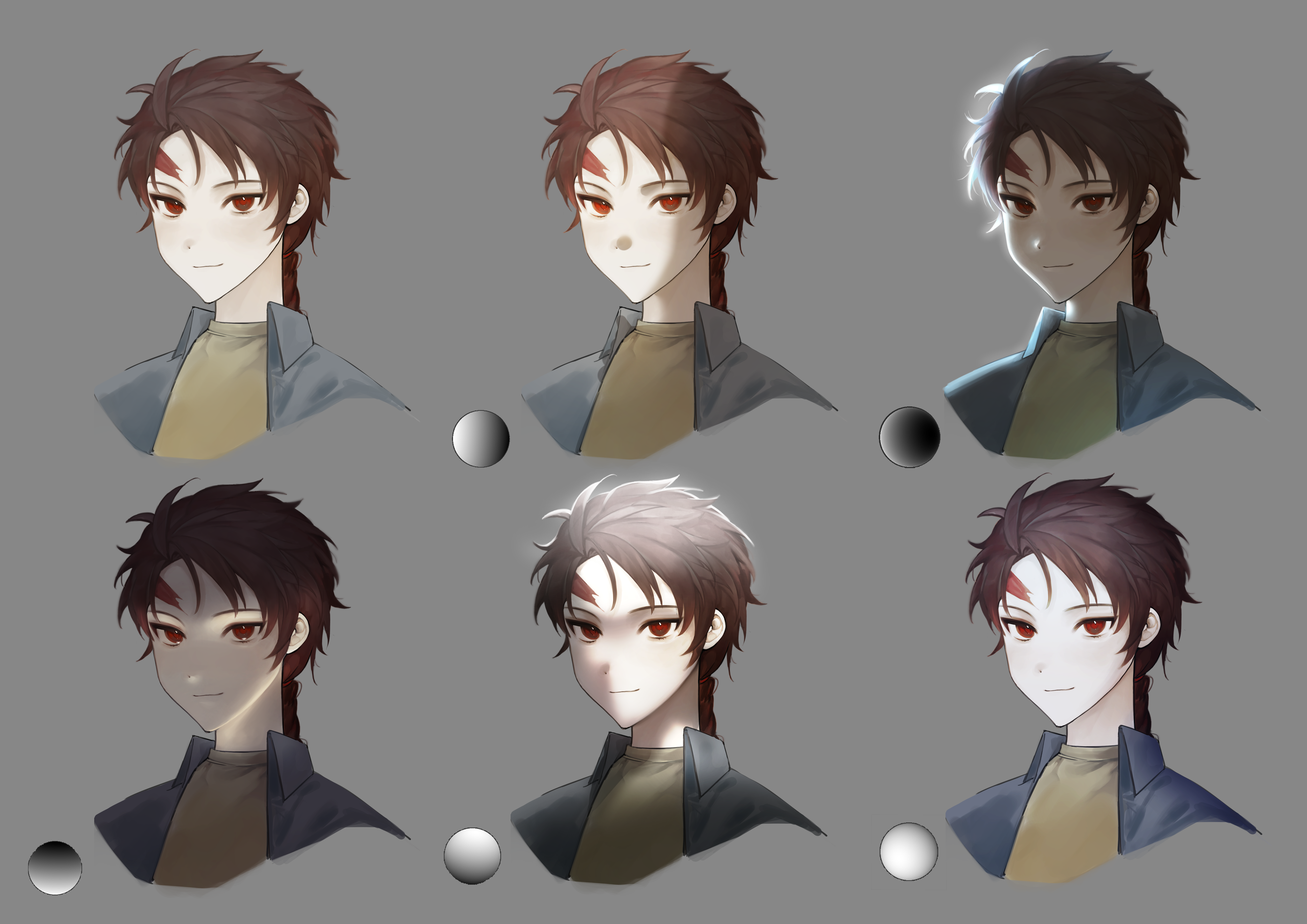 1boy absurdres art_study blue_jacket braid brown_hair chinese_commentary closed_mouth collared_jacket commentary_request grey_background harada_minoru highres jacket kyoko_(akakikyoko) lighting_practice male_focus open_clothes open_jacket portrait red_eyes saibou_shinkyoku scar scar_on_face shirt simple_background smile variations yellow_shirt