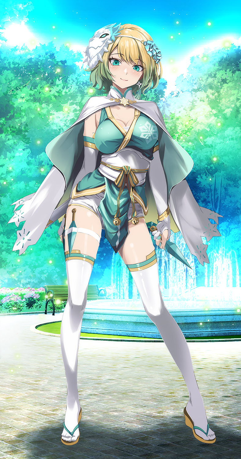 1girl bench blonde_hair bloom blue_eyes breasts bush cape cleavage earrings elbow_gloves fire_emblem fire_emblem_heroes fjorm_(fire_emblem) fjorm_(ninja)_(fire_emblem) fountain gloves gradient_hair highres holding holding_weapon jewelry kunai looking_at_viewer mask mask_on_head medium_breasts multicolored_hair ninja nintendo official_alternate_costume outdoors park park_bench road sandals short_hair short_shorts shorts shuriken smile solo sunlight thighhighs tree tsukishiro_saika weapon white_gloves white_mask white_shorts white_thighhighs zouri