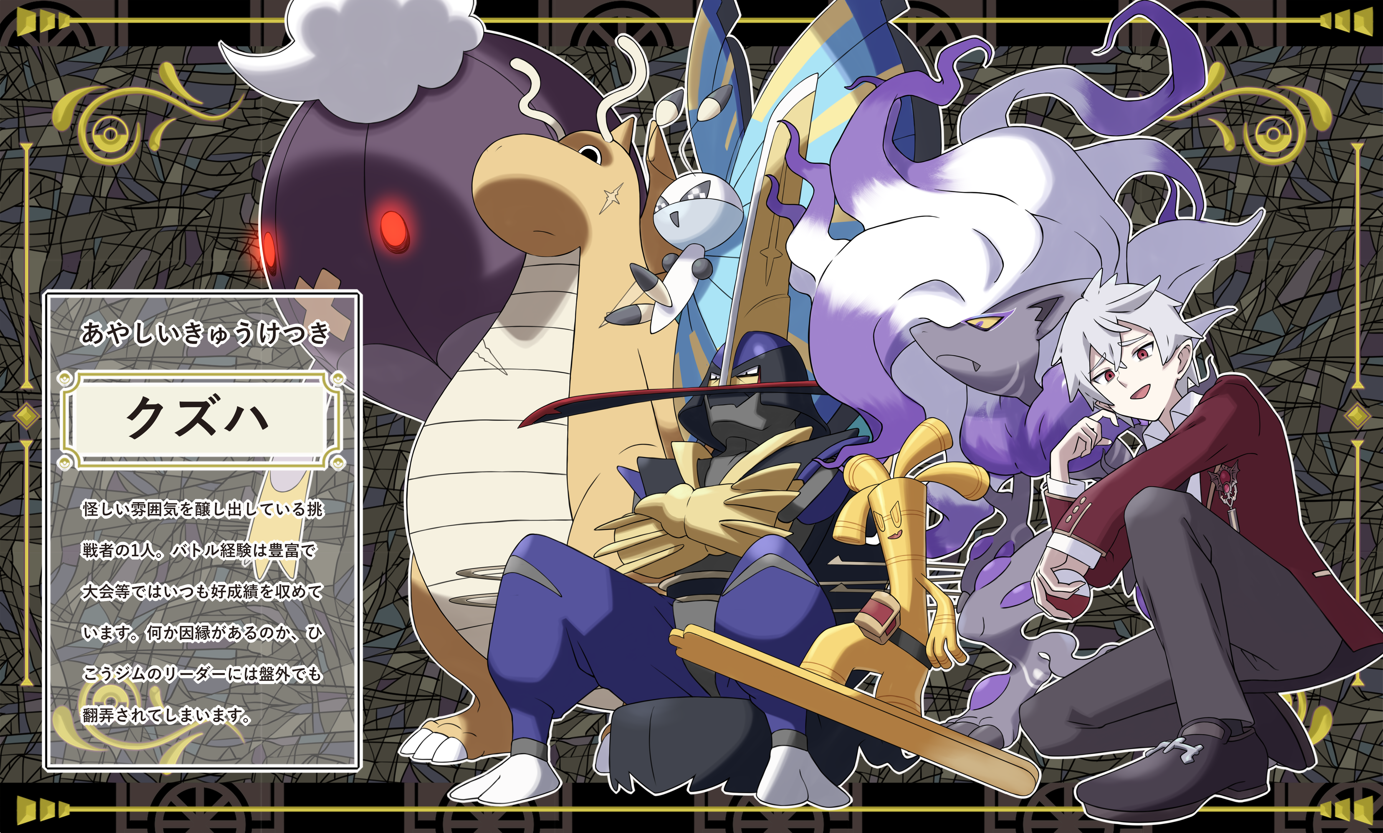 abstract_background absurdres alternate_color battle_scarred black_border black_footwear black_pants blazer border character_name collared_shirt crossover dragonite drifblim furrowed_brow gen_1_pokemon gen_4_pokemon gen_6_pokemon gholdengo glowing glowing_eyes grey_hair highres hisuian_zoroark holding holding_poke_ball jacket kingambit kuzuha_(nijisanji) long_sleeves looking_at_viewer nijisanji nintendo on_one_knee open_mouth pants parody pointy_ears poke_ball pokemon pokemon_(creature) pokemon_scarlet_and_violet red_eyes red_jacket school_uniform shiny_pokemon shirogami_seisho shirt shoes short_hair sitting smile smug style_parody translation_request virtual_youtuber vivillon vivillon_(fancy) white_shirt