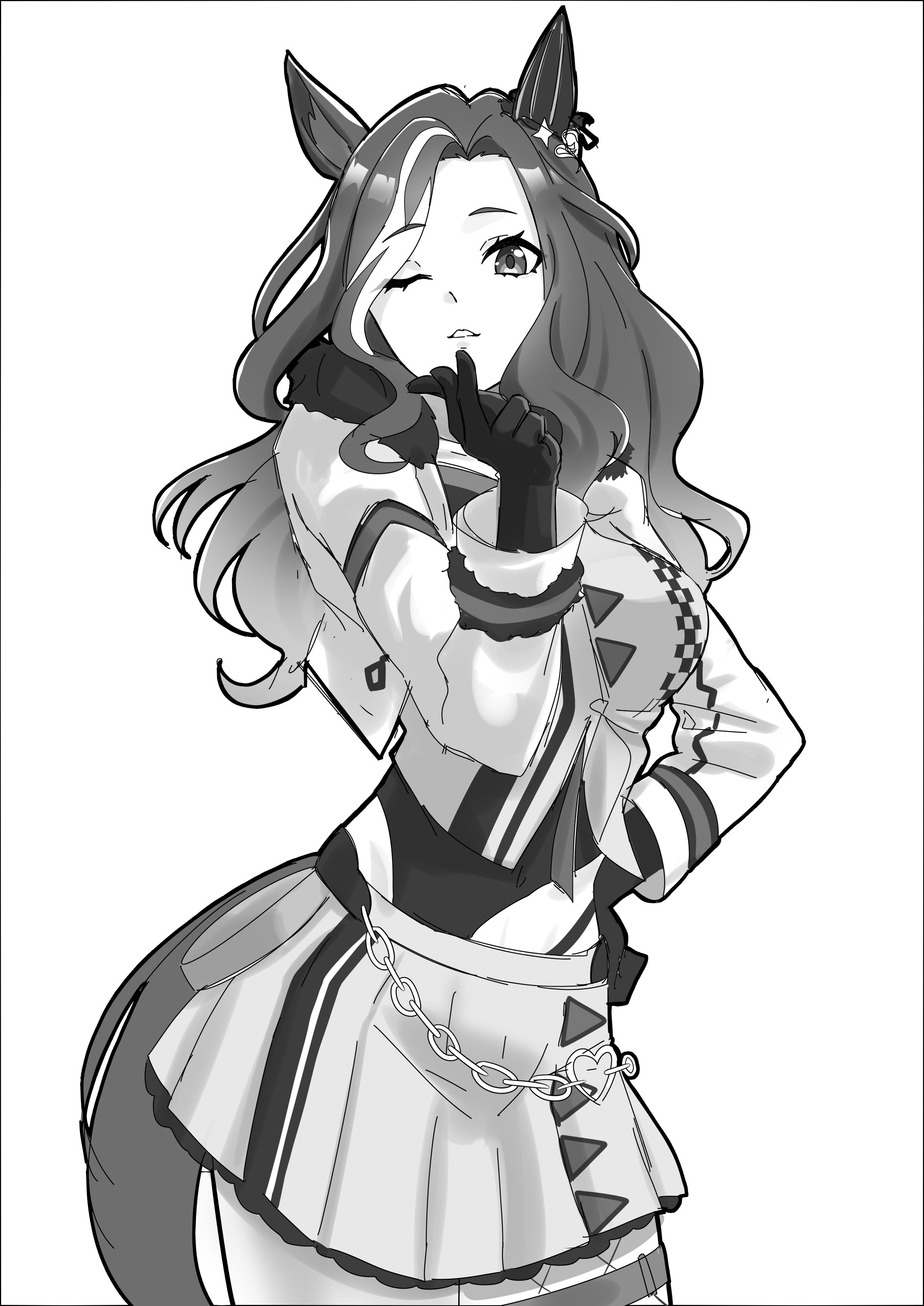 1girl absurdres animal_ears commentary daring_heart_(umamusume) ear_covers greyscale highres horse_ears horse_girl long_hair looking_at_viewer monochrome multicolored_hair one_eye_closed senchan_7 simple_background single_ear_cover solo streaked_hair untranslatable_commentary umamusume white_background white_hair