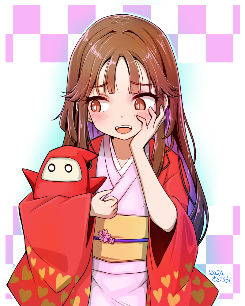 1girl artist_name blush brown_eyes brown_hair checkered_background commentary_request dated flower hand_on_own_cheek hand_on_own_face heart heart_print holding jajamaru_(ninja_jajamaru-kun) japanese_clothes kimono long_hair long_sleeves looking_at_another ninja_jajamaru-kun o_o open_mouth pink_flower purple_background red_kimono saburouta_(hox-666) sakura-hime_(ninja_jajamaru-kun) teeth upper_teeth_only white_background wide_sleeves