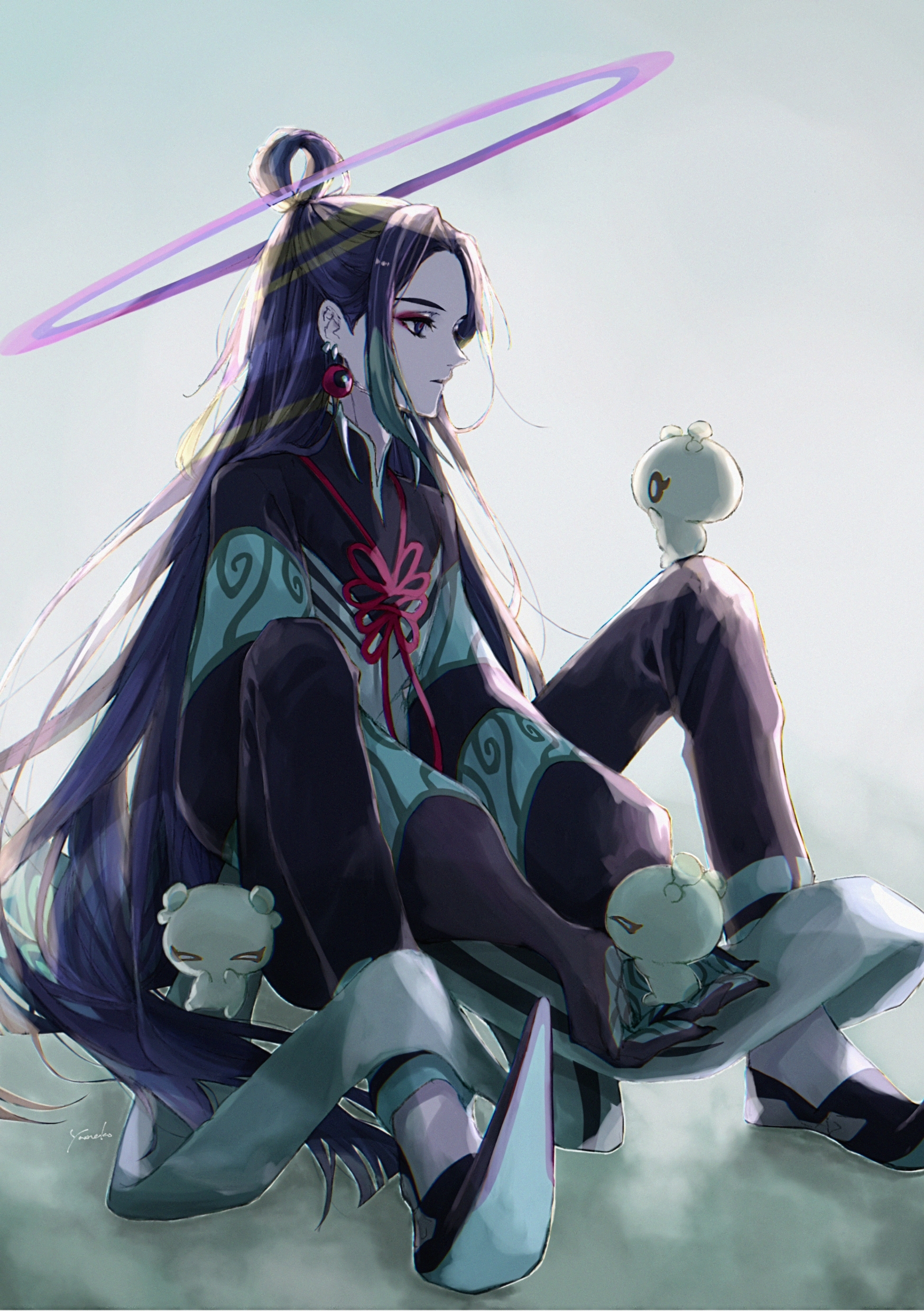 1boy absurdres aged_up black_hair black_pants blue_eyes chinese_clothes con_(fate) earrings eyeshadow fate/grand_order fate_(series) gloves green_eyes hair_rings halo highres holding jewelry long_hair long_sleeves makeup male_focus multicolored_eyes multicolored_hair pale_skin pants red_eyes red_eyeshadow sitting taisui_xingjun_(adult)_(fate) taisui_xingjun_(fate) yumeko_(fgo39625963)