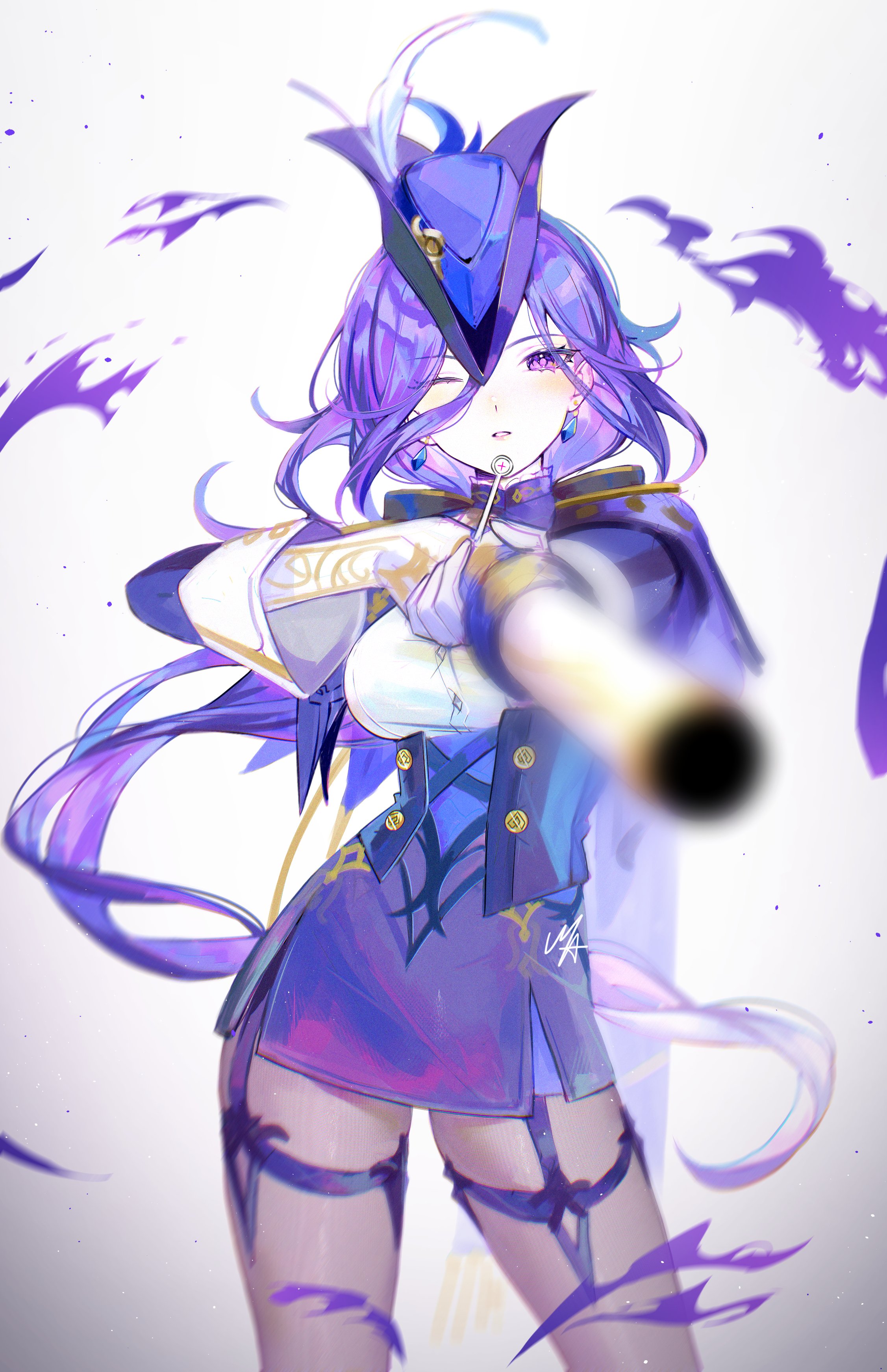 1girl absurdres ani_019 blurry blurry_background clorinde_(genshin_impact) cowboy_shot genshin_impact gloves gun hat hat_feather high-waist_skirt highres holding holding_gun holding_weapon long_hair looking_at_viewer miniskirt one_eye_closed pantyhose parted_lips purple_eyes purple_hair purple_skirt shirt skirt solo standing thigh_strap tricorne very_long_hair weapon white_gloves white_shirt