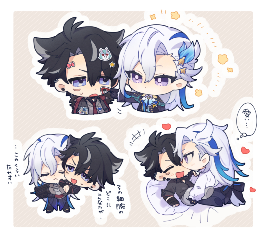 +++ 2boys :< ^_^ ascot asymmetrical_bangs bandaged_arm bandages black_footwear black_gloves black_hair black_pants black_shirt blue_coat blue_eyes blue_hair boots border carrying chibi closed_eyes closed_mouth coat coat_on_shoulders collared_shirt commentary_request cropped_shoulders ear_piercing earrings facial_scar flower_symbol fur-trimmed_coat fur_trim genshin_impact gloves grey_background grey_hair grey_pants grey_vest hair_between_eyes hair_ornament heart jewelry koma_(km_mmmk) long_hair looking_at_another male_focus melusine_(genshin_impact) multicolored_hair multiple_boys multiple_views necktie neuvillette_(genshin_impact) open_mouth outline pants parted_bangs piercing pillow pointy_ears princess_carry purple_eyes red_necktie scar scar_on_arm scar_on_cheek scar_on_face shirt short_hair short_sleeves simple_background speech_bubble star_(symbol) sticker sticker_on_face sticker_on_hair streaked_hair striped_background stud_earrings sweatdrop thought_bubble translation_request two-sided_coat two-sided_fabric u_u upper_body v-shaped_eyebrows vest white_ascot white_border white_hair white_outline white_shirt wriothesley_(genshin_impact)
