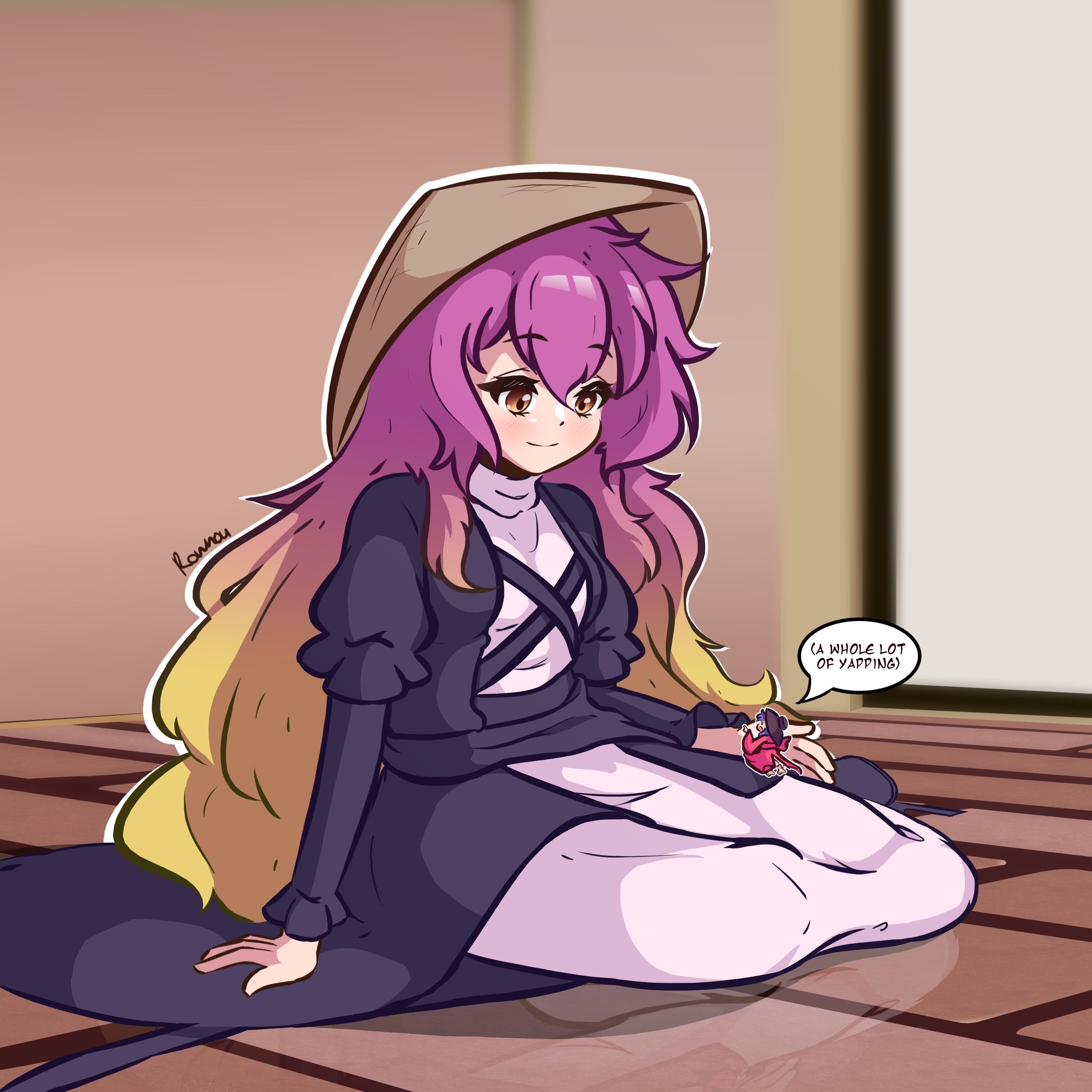 2girls absurdres ajirogasa arm_support barefoot black_dress black_footwear blonde_hair boots bowl bowl_hat breasts closed_mouth commentary cross-laced_clothes cross-laced_dress dress english_commentary english_text full_body gradient_hair hair_between_eyes hat highres hijiri_byakuren indoors japanese_clothes juliet_sleeves kimono layered_dress light_blush long_hair long_sleeves looking_at_another looking_down looking_up mini_person minigirl multicolored_hair multiple_girls on_floor open_mouth outline pointing pointing_at_another puffy_sleeves purple_hair red_kimono reflective_floor rownou rownou sitting sitting_on_lap sitting_on_person small_breasts smile speech_bubble sukuna_shinmyoumaru touhou turtleneck turtleneck_dress white_dress white_outline wide_sleeves yellow_eyes yokozuwari