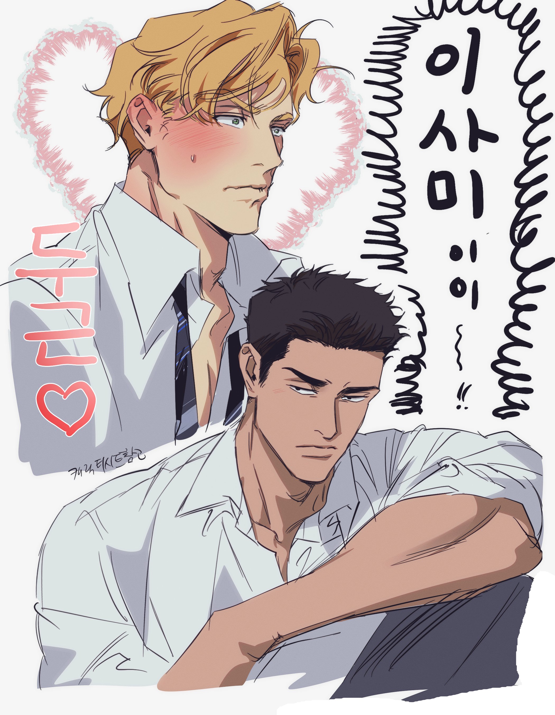 2boys absurdres ao_isami bara black_hair blonde_hair blue_eyes blush closed_mouth cropped_torso elbow_on_knee heart heart_background highres korean_commentary korean_text lewis_smith looking_to_the_side male_focus multiple_boys nagyuuuuuryyy necktie pectoral_cleavage pectorals shirt short_hair sideburns sketch sweatdrop undone_necktie white_background white_shirt yuuki_bakuhatsu_bang_bravern