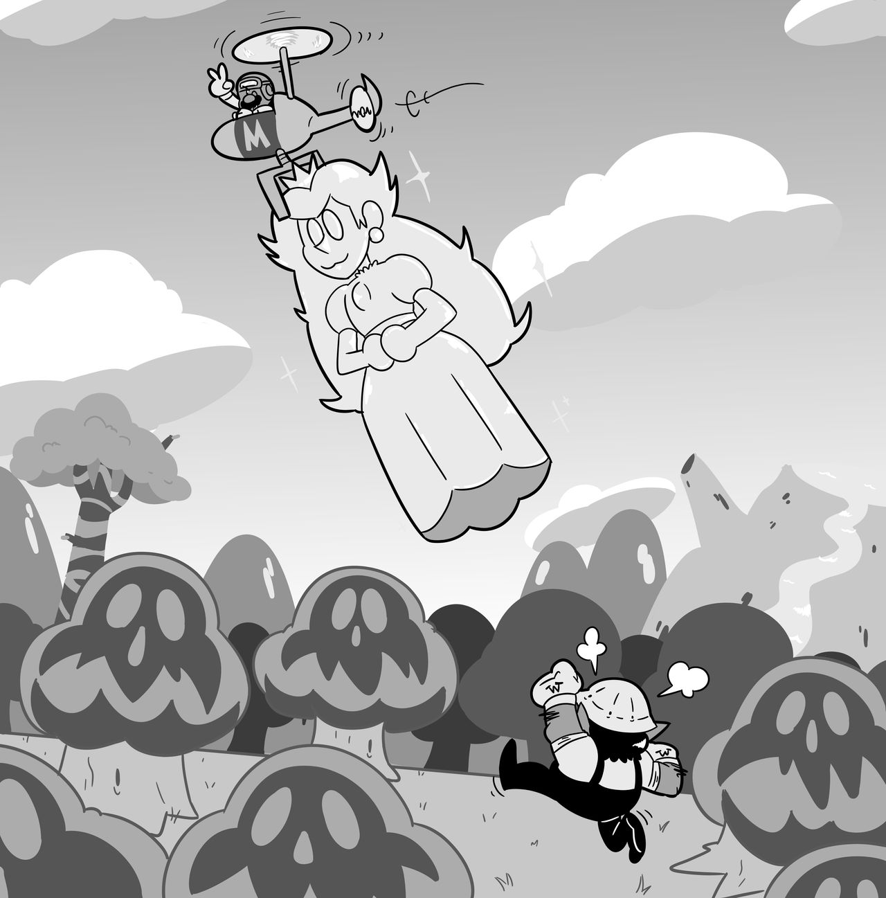 2boys angry carrying facial_hair fat fat_man flying flying_vehicle forest gloves hand_up hat highres looking_at_another mario mario_(series) multiple_boys mustache nature nintendo one_eye_closed overalls princess_peach running statue super_mario_land_3 tree v wario wario_land wink