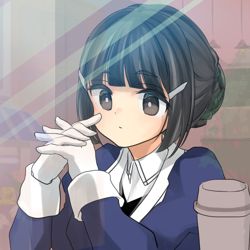1girl black_eyes black_hair blunt_bangs closed_mouth commentary_request cup gloves hair_bun hair_ornament hairclip harusatomi interlocked_fingers jacket kantai_collection long_sleeves military military_uniform myoukou_(kancolle) own_hands_together school_uniform single_hair_bun solo upper_body white_gloves