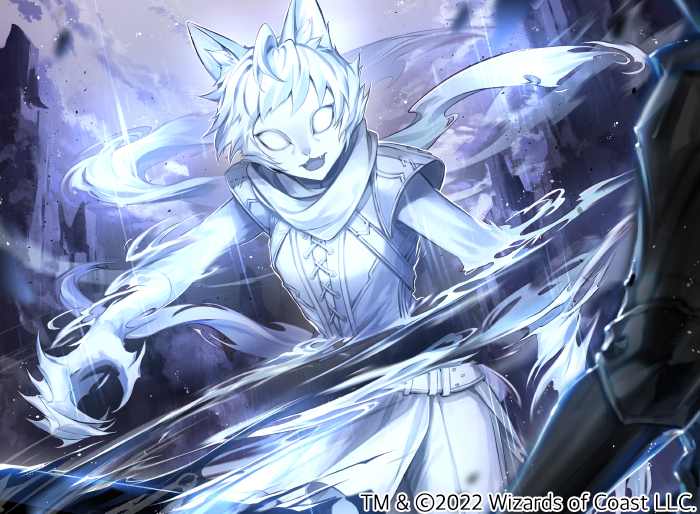 1girl 1other 2022 :3 animal_ears armor belt cat_ears animal_nose cat_tail clawed_hands colored_skin commentary_request copyright_notice cowboy_shot cropped_legs dated dated_commentary fangs ghost_girl leather_armor looking_at_viewer magic magic:_the_gathering medium_hair mixed-language_commentary official_art scarf sila_(carpen) solid_eyes tail white_eyes white_hair white_skin