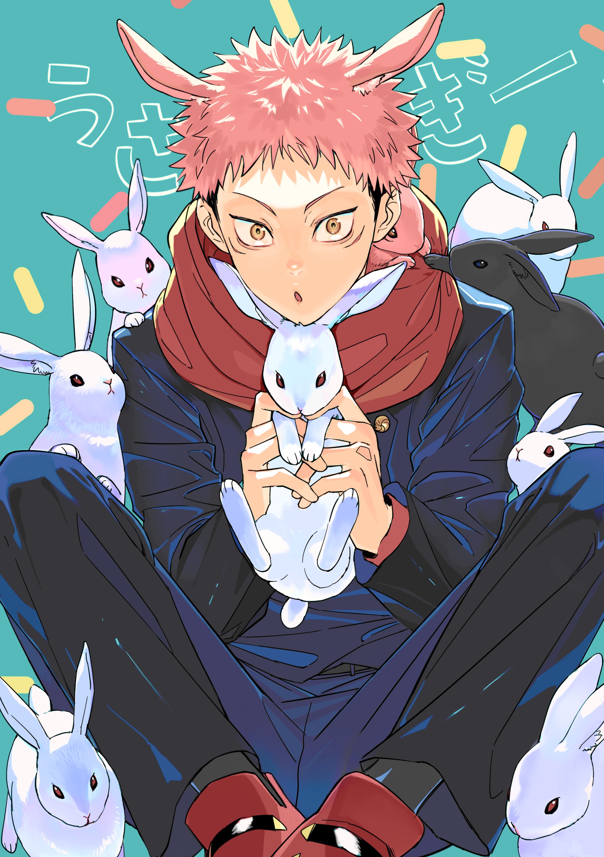 1boy absurdres animal animal_ears aqua_background black_rabbit_(animal) buttons cropped_legs highres holding holding_animal holding_rabbit itadori_yuji jujutsu_kaisen jujutsu_tech_uniform looking_at_viewer luantama1 male_focus pink_hair pout rabbit rabbit_ears red_footwear red_hood scar scar_on_face shoes undercut white_rabbit_(animal) yellow_eyes